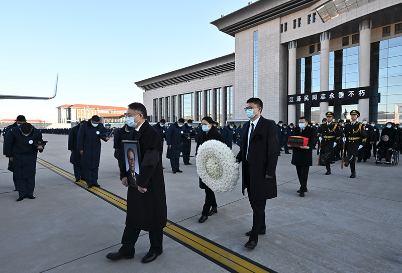 靈車緩緩駛入西郊機場。松柏靜立,遠山靜默。空軍官兵列隊脫帽,目送載護江澤民同志骨灰的專機起飛。專機盤旋著,在首都北京上空緩緩繞飛一周,告別這一江澤民同志為黨和國家事業傾盡心血的地方。