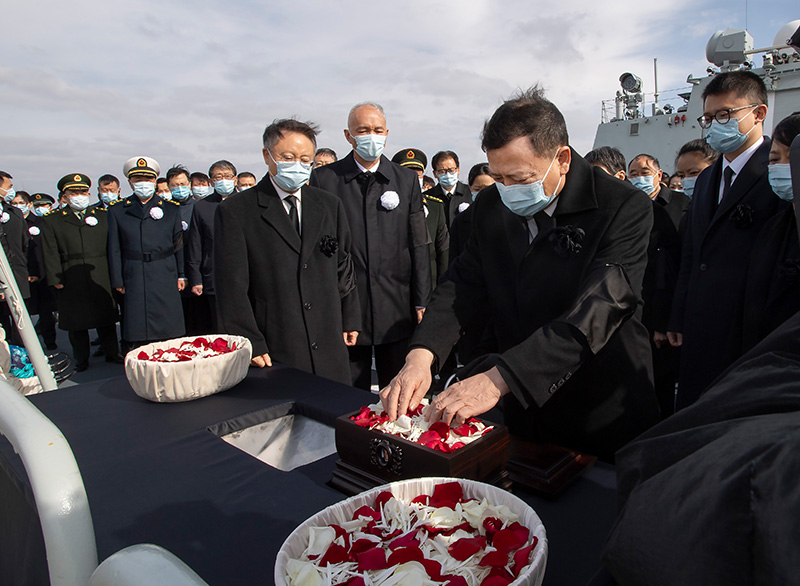 12月11日,遵照江澤民同志及其親屬的意愿,敬愛的江澤民同志的骨灰在長江入海口撒入大海。受黨中央委托,中共中央政治局常委、中央書記處書記蔡奇等領導同志和江澤民同志的夫人王冶坪等親屬護送骨灰撒放。新華社記者 李濤 攝