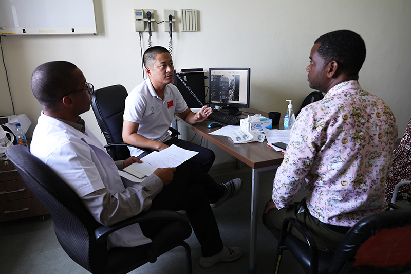 2023年2月22日,在坦桑尼亞桑給巴爾島納茲莫加醫(yī)院,中國援桑給巴爾醫(yī)療隊成員郭偉(左二)給病人看病。新華社記者 董江輝 攝