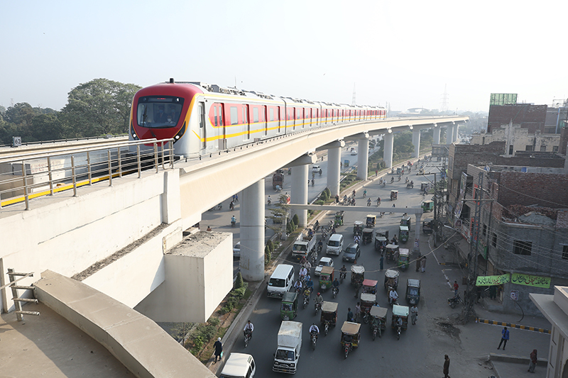 在巴基斯坦拉合爾市,巴基斯坦首條地鐵拉合爾橙線一輛地鐵列車準(zhǔn)備進(jìn)站(2020年10月26日攝)。新華社記者劉天攝