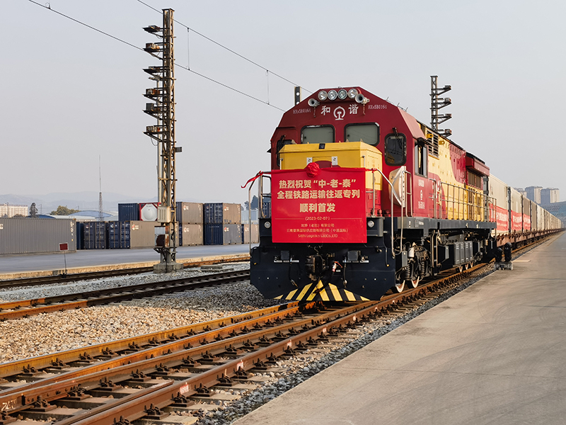 2023年2月7日,“中老泰”全程鐵路運輸往返班列首發(fā)列車從云南省中鐵聯(lián)集昆明中心站駛出。新華社記者 丁怡全 攝