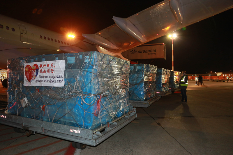 在塞爾維亞首都貝爾格萊德,寫有 “鐵桿朋友,風雨同行”字樣的中方捐贈醫療物資從飛機上卸下(2020年3月21日攝)。新華社記者 石中玉 攝