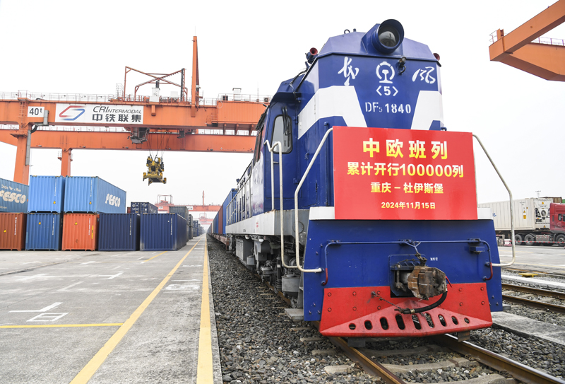 2024年11月15日,第10萬(wàn)列中歐班列——X8083次中歐班列(重慶—杜伊斯堡)在重慶團(tuán)結(jié)村中心站準(zhǔn)備發(fā)車。新華社記者 王全超 攝