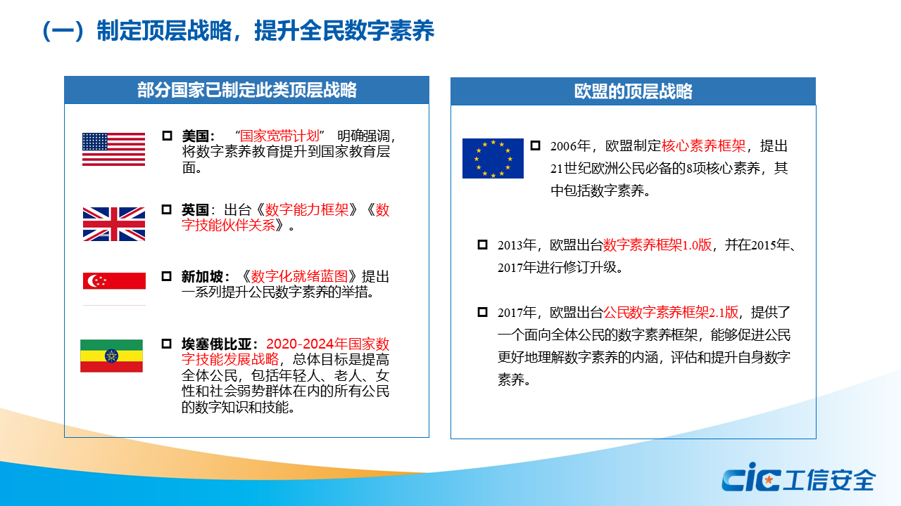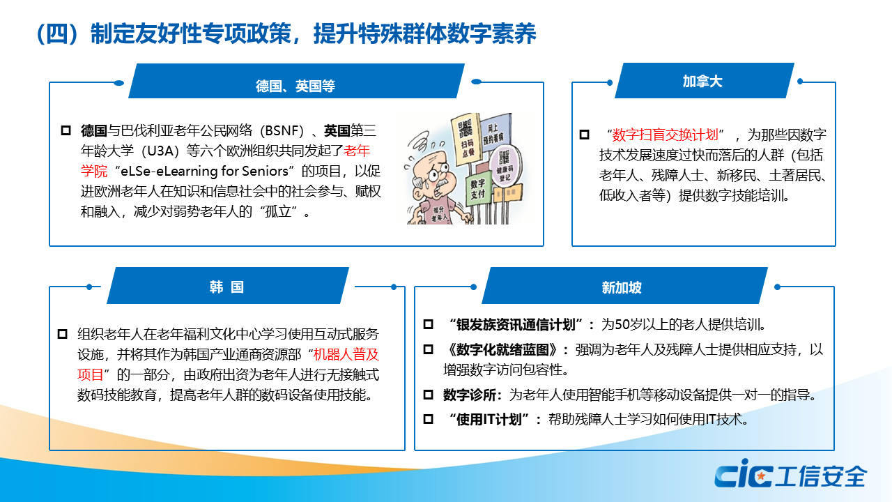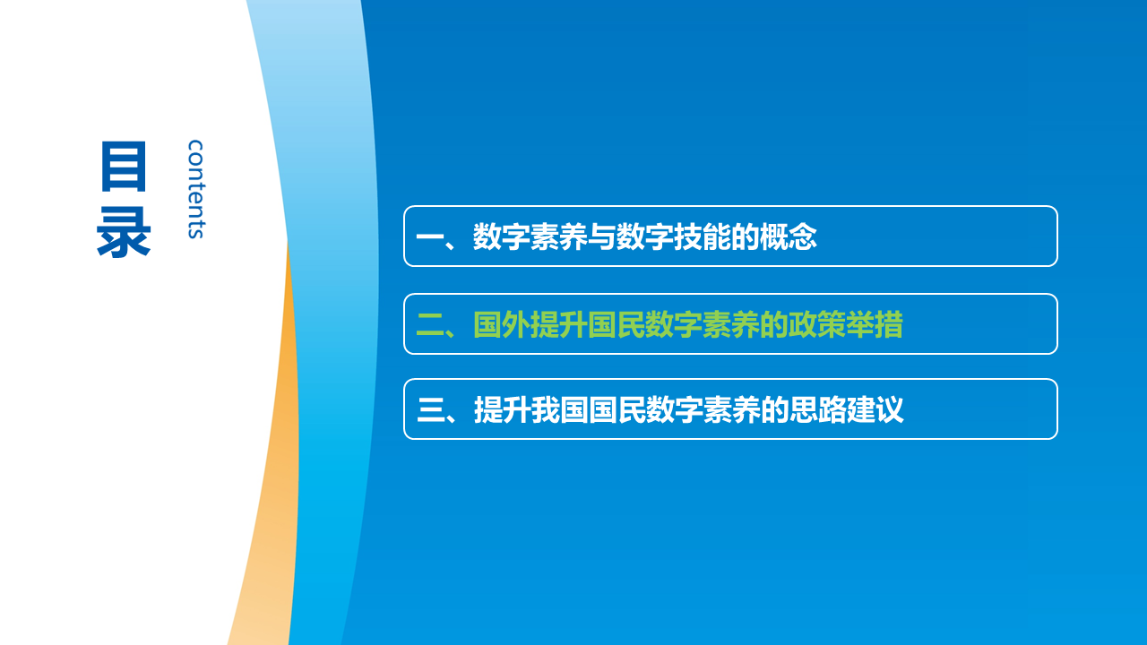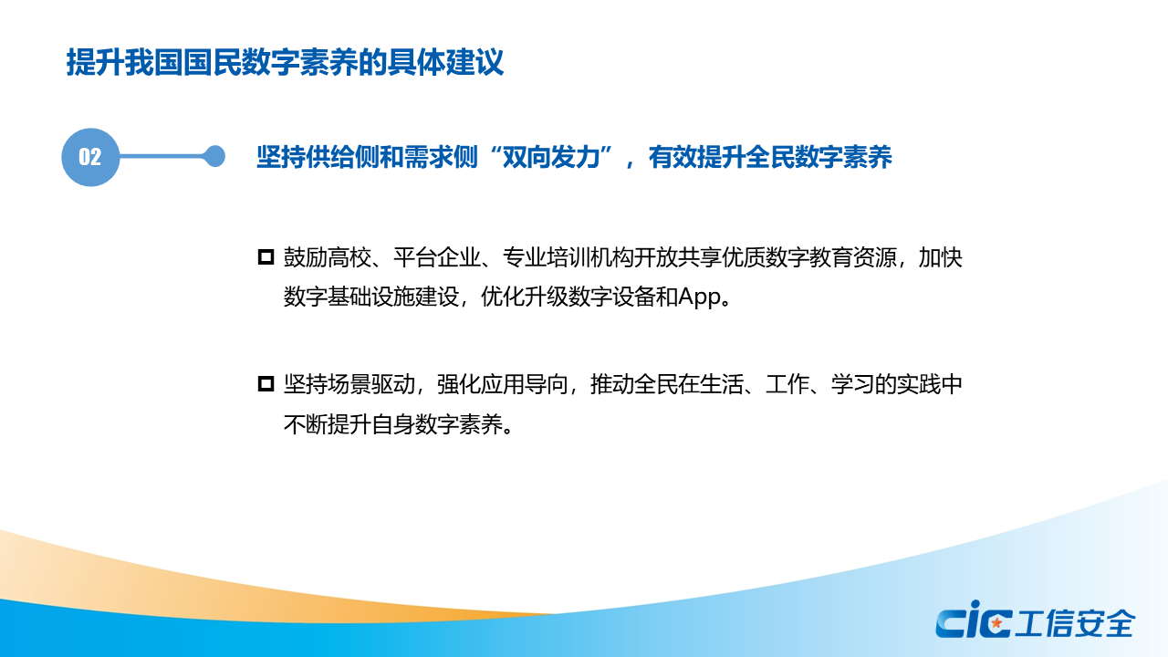 蔣艷指出,數(shù)字素養(yǎng)是數(shù)字經(jīng)濟(jì)社會(huì)中公民工作生活學(xué)習(xí)應(yīng)具備的數(shù)字獲取、制作、使用、評(píng)價(jià)、交互、分享、創(chuàng)新、安全保障、倫理道德等一系列素質(zhì)與能力的集合。全球主要國(guó)家和地區(qū)紛紛制定頂層戰(zhàn)略,實(shí)施相關(guān)政策,開(kāi)展數(shù)字教育專項(xiàng)行動(dòng),加強(qiáng)職業(yè)教育培訓(xùn)和技能認(rèn)證,推出面向特殊群體的友好性專項(xiàng)政策,提升全民數(shù)字素養(yǎng)。
