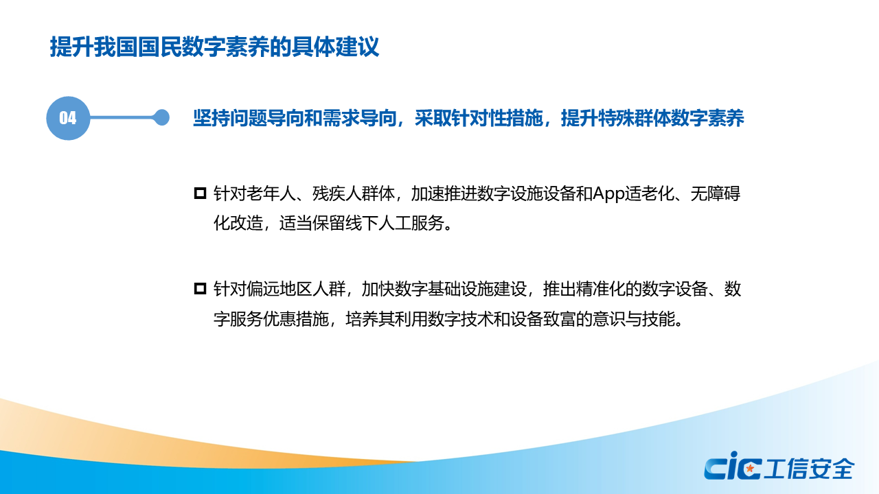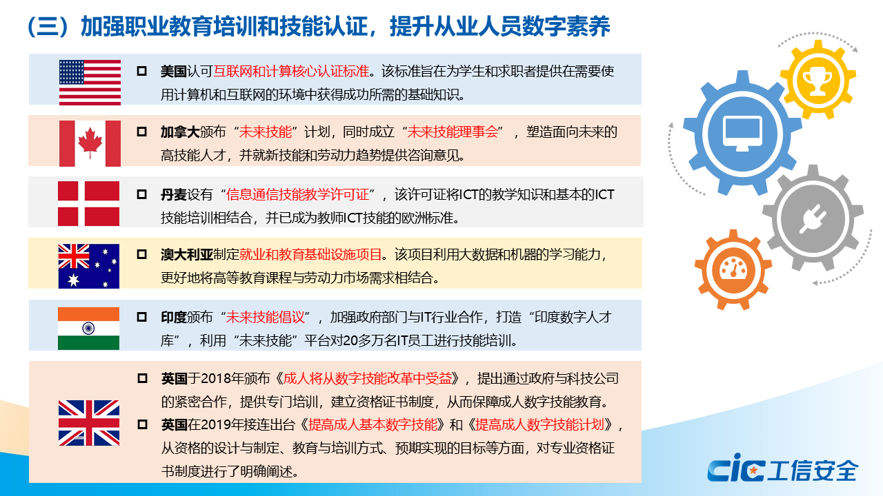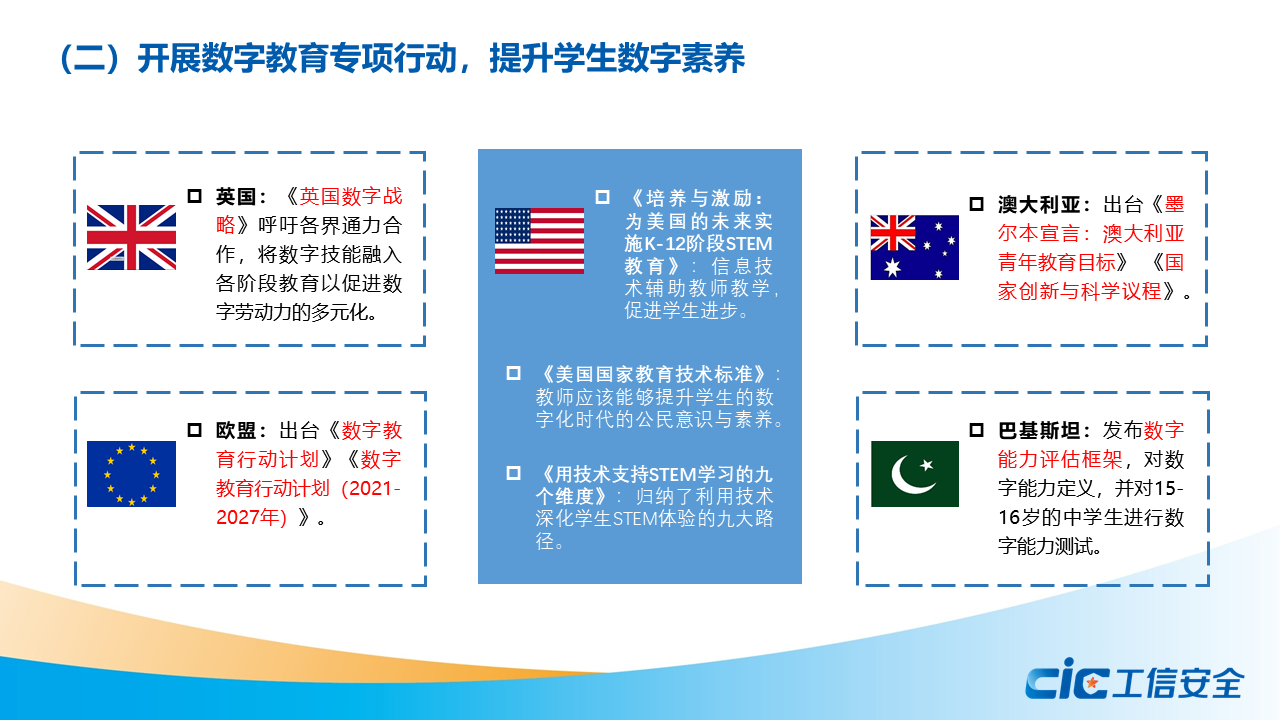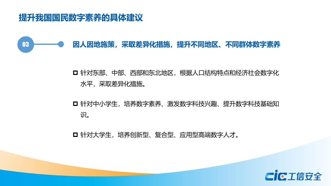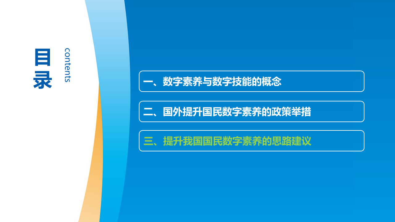 蔣艷指出,數(shù)字素養(yǎng)是數(shù)字經(jīng)濟(jì)社會(huì)中公民工作生活學(xué)習(xí)應(yīng)具備的數(shù)字獲取、制作、使用、評(píng)價(jià)、交互、分享、創(chuàng)新、安全保障、倫理道德等一系列素質(zhì)與能力的集合。全球主要國(guó)家和地區(qū)紛紛制定頂層戰(zhàn)略,實(shí)施相關(guān)政策,開(kāi)展數(shù)字教育專項(xiàng)行動(dòng),加強(qiáng)職業(yè)教育培訓(xùn)和技能認(rèn)證,推出面向特殊群體的友好性專項(xiàng)政策,提升全民數(shù)字素養(yǎng)。