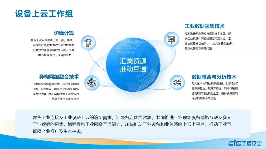設備上云工作組主要聚焦工業連接及工業設備上云的迫切需求,匯聚各方優勢資源,共同推進工業現場設備網絡互聯及多元工業數據的采集,增強異構工業網絡互通能力,加快推動工業設備和業務系統上云上平臺,推動工業互聯網產業推廣及生態建設。