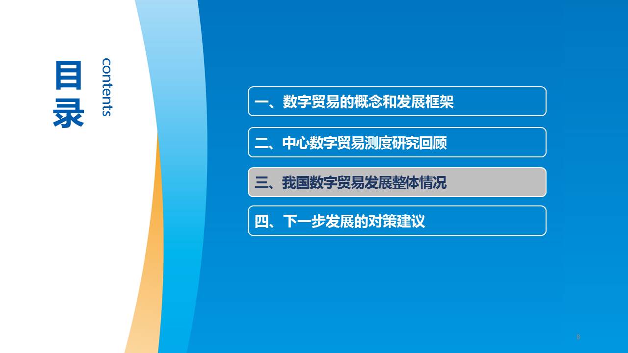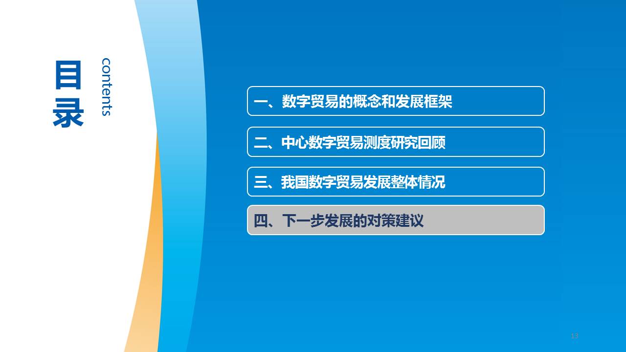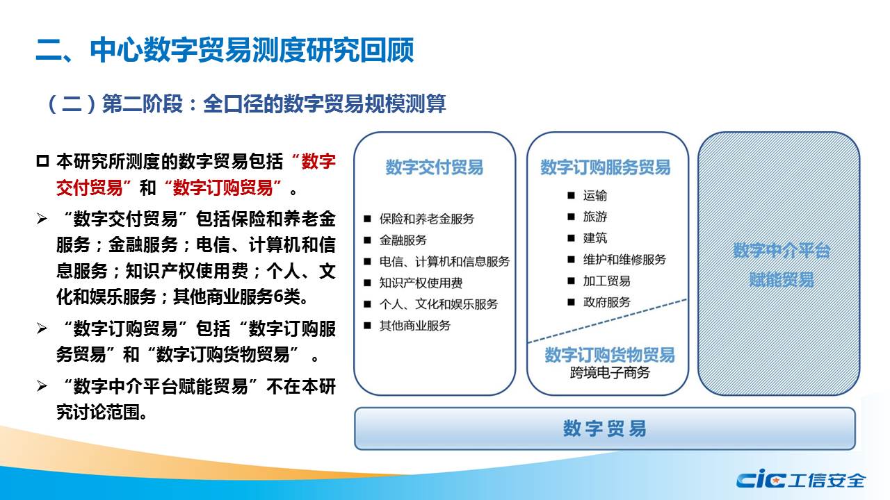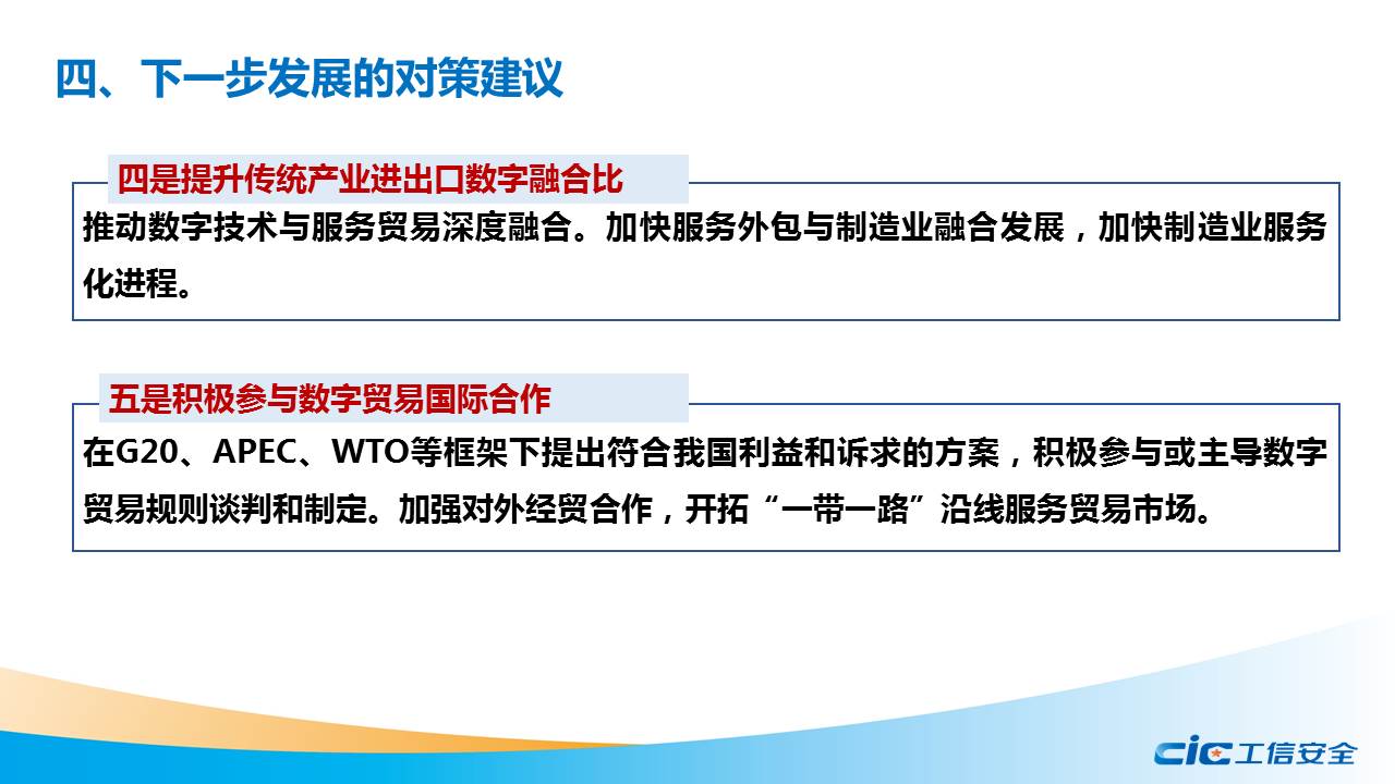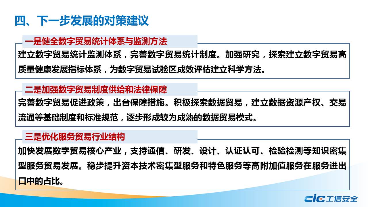 黃鵬指出,發展適合我國國情的數字貿易概念框架和測度體系對我國提升數字貿易規則制定話語權具有重要意義。要緊密跟蹤國際組織和主要國家數字貿易測度方法和政策制定的最新進展,整合統計資源,拓展數據來源,建立既符合我國發展特點,又能與國際接軌的數字貿易測度框架。