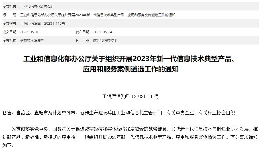 來源:工業和信息化部辦公廳關于組織開展2023年新一代信息技術典型產品、應用和服務案例遴選工作的通知