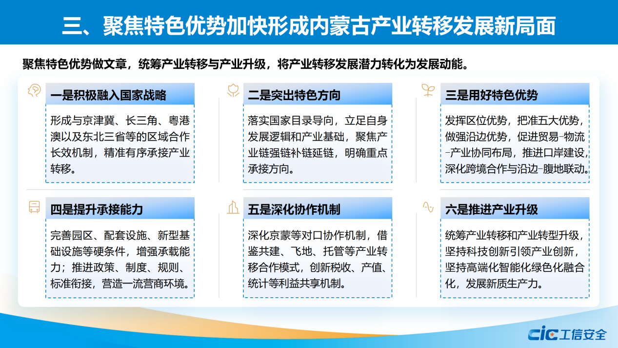 蔣艷在主題發(fā)言中提出,黨中央、國務(wù)院高度重視產(chǎn)業(yè)轉(zhuǎn)移工作,近年來,國內(nèi)產(chǎn)業(yè)轉(zhuǎn)移規(guī)模和質(zhì)量水平顯著提升,有力促進(jìn)區(qū)域協(xié)調(diào)發(fā)展,拉動(dòng)產(chǎn)業(yè)升級(jí)和價(jià)值鏈攀升,推動(dòng)中西部地區(qū)特色產(chǎn)業(yè)體系向“新”向“綠”發(fā)展。隨著全球第五次產(chǎn)業(yè)轉(zhuǎn)移持續(xù)演進(jìn),產(chǎn)業(yè)國際轉(zhuǎn)移和國內(nèi)轉(zhuǎn)移交織融合、深化發(fā)展,推動(dòng)產(chǎn)業(yè)國內(nèi)轉(zhuǎn)移的戰(zhàn)略性、緊迫性更加突出,同時(shí),新的形勢(shì)變化也為中西部地區(qū)搶抓戰(zhàn)略機(jī)遇、承接優(yōu)勢(shì)特色產(chǎn)業(yè)轉(zhuǎn)移創(chuàng)造了新條件。內(nèi)蒙古是產(chǎn)業(yè)國內(nèi)梯度轉(zhuǎn)移的重要承接地,產(chǎn)業(yè)轉(zhuǎn)移發(fā)展迎來三大機(jī)遇、擁有五大獨(dú)特優(yōu)勢(shì),建議聚焦特色優(yōu)勢(shì)做文章,同時(shí)統(tǒng)籌做好產(chǎn)業(yè)轉(zhuǎn)移與產(chǎn)業(yè)升級(jí),將產(chǎn)業(yè)轉(zhuǎn)移發(fā)展?jié)摿D(zhuǎn)化為發(fā)展動(dòng)能,從積極融入國家戰(zhàn)略、突出特色方向、用好特色優(yōu)勢(shì)、提升承接能力、深化協(xié)作機(jī)制、推進(jìn)產(chǎn)業(yè)升級(jí)等六方面著手,加快形成內(nèi)蒙古產(chǎn)業(yè)轉(zhuǎn)移發(fā)展新局面。