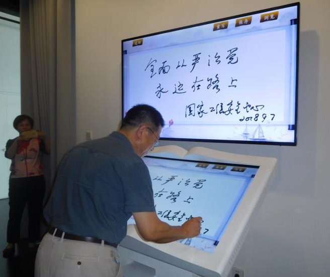 紀委書記郝志強應邀在廉政教育基地電子屏提筆留言:“全面從嚴治黨永遠在路上。”今后,中心紀委將進一步加強廉政文化教育,強化法律觀念,提高遵紀守法意識,構筑廉潔從政的防線,為中心新時代新發展提供堅強紀律保證。
