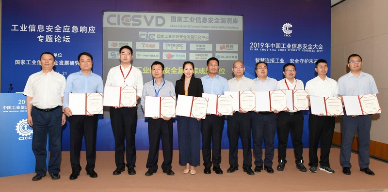 為發揮工業信息安全產業發展聯盟的橋梁作用,提高我國工業信息安全漏洞研究水平和及時預防能力,國家工業信息安全發展研究中心聯合十家漏洞庫技術支持組成員單位建設了國家工業信息安全漏洞庫。會上,程曉明為威努特、天融信、恒安嘉新、南瑞信通、網神信息、知道創宇、神州綠盟、啟明星辰、海康威視和江蘇博智十家漏洞庫首批成員單位頒發了證書。