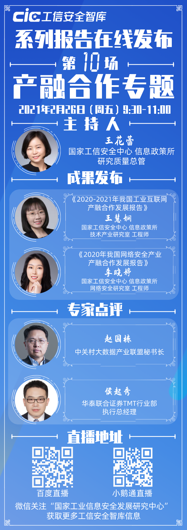 第十場“工信安全智庫”系列報告在線發布活動將于2月26日上午9:30準時上線。本次發布活動重點圍繞黨的十九屆五中全會提出的“推動經濟體系優化升級加快發展現代產業體系”和《中共中央關于制定國民經濟和社會發展第十四個五年規劃和二〇三五年遠景目標的建議》中的“構建金融有效支持實體經濟的體制機制”等要求,以“產融合作”為主題,發布《2020-2021年我國工業互聯網產融合作發展報告》和《2020年我國網絡安全產業產融合作發展報告》兩份“工信安全智庫”洞察系列報告。發布活動將由中心信息政策所研究質量總管王花蕾主持。