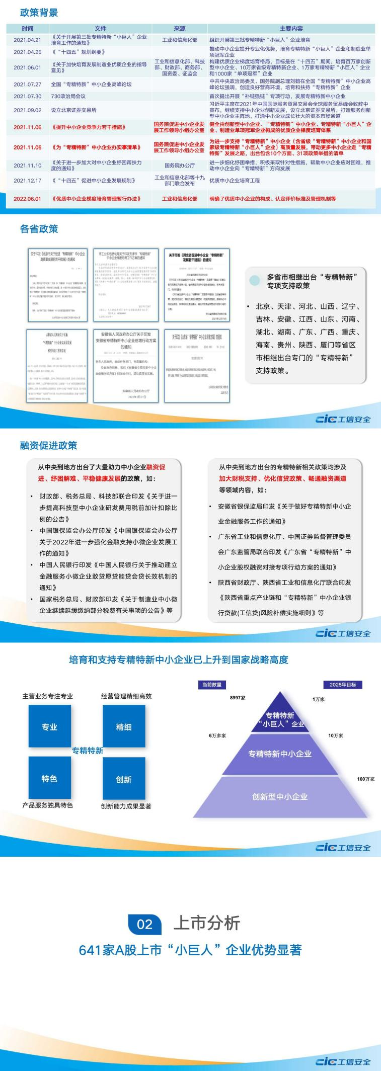 報告梳理了習(xí)近平總書記對專精特新中小企業(yè)的重要指示,以及上市小巨人企業(yè)發(fā)展所乘借的政策東風(fēng),分析了從中央到地方出臺的一系列促進(jìn)中小企業(yè)專精特新發(fā)展的政策、融資促進(jìn)舉措。在這些政策的扶持下,工業(yè)和信息化部目前已培育專精特新“小巨人”企業(yè)8997家。