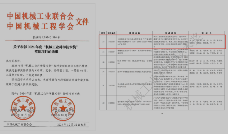 2024年10月22日,中國機械工業聯合會、中國機械工程學會聯合發布《關于表彰2024年度“機械工業科學技術獎”獎勵項目的通報》(機械科〔2024〕316號),由國家工業信息安全發展研究中心牽頭,聯合清華大學、成都飛機工業(集團)有限責任公司、徐州徐工挖掘機械有限公司、機械工業儀器儀表綜合技術經濟研究所、中車長春軌道客車股份有限公司等單位共同完成的“《信息化和工業化融合管理體系 生產設備管理能力成熟度評價(GB/T 23021-2022)》研制與產業應用”項目榮獲2024年度機械工業科學技術獎二等獎。