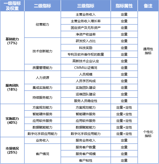 《報告》按照汽車行業企業數字化轉型的主要業務領域及重點需求,將服務商分為研發、生產、供應鏈、銷售、服務5個大類,并提出了涵蓋基礎能力、服務團隊、實施能力、市場情況4個一級指標、13個二級指標、23個三級指標的汽車行業數字化轉型服務商能力評價體系