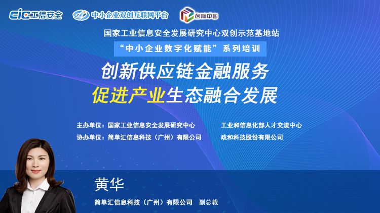 7月30日,由國家工業(yè)信息安全發(fā)展研究中心聯(lián)合工業(yè)和信息化部人才交流中心推出的“中小企業(yè)數(shù)字化賦能”系列直播第十二期暨2020“創(chuàng)響中國”國家工業(yè)信息安全發(fā)展研究中心雙創(chuàng)示范基地站系列活動(dòng)“創(chuàng)新供應(yīng)鏈金融服務(wù),促進(jìn)產(chǎn)業(yè)生態(tài)融合發(fā)展”圓滿完成。簡單匯信息科技(廣州)有限公司副總裁黃華女士在課程中分享到:供應(yīng)鏈已深度嵌入生產(chǎn)流通的各個(gè)環(huán)節(jié),成為連接供給側(cè)和需求側(cè)的關(guān)鍵紐帶,而供應(yīng)鏈金融也成為金融供給側(cè)結(jié)構(gòu)性改革的重要抓手,探索供應(yīng)鏈金融創(chuàng)新,實(shí)現(xiàn)產(chǎn)業(yè)生態(tài)融合發(fā)展。