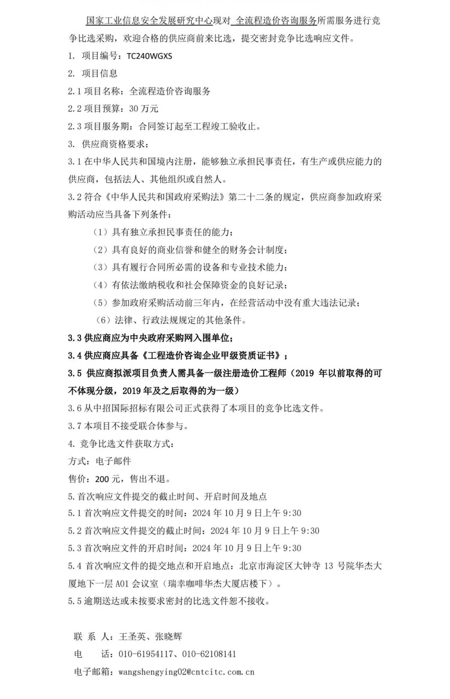 國家工業(yè)信息安全發(fā)展研究中心全流程造價咨詢服務(wù)競爭比選文件