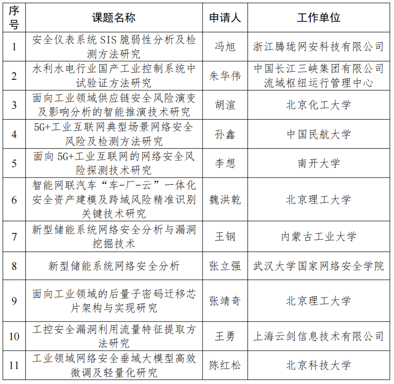 2025年10月,工業(yè)信息安全感知與評估技術工業(yè)和信息化部重點實驗室(以下簡稱部重點實驗室)公開發(fā)布本年度開放課題申請指南。2025年12月26日,部重點實驗室邀請專家在北京召開課題立項評審會,會上專家組聽取了課題牽頭單位的立項匯報,審閱了相關材料,并進行質(zhì)詢與討論,最終11個課題通過立項評審。部重點實驗室2025年開放課題立項評審結(jié)果如下表所示: 表 部重點實驗室2025年開放課題立項評審結(jié)果