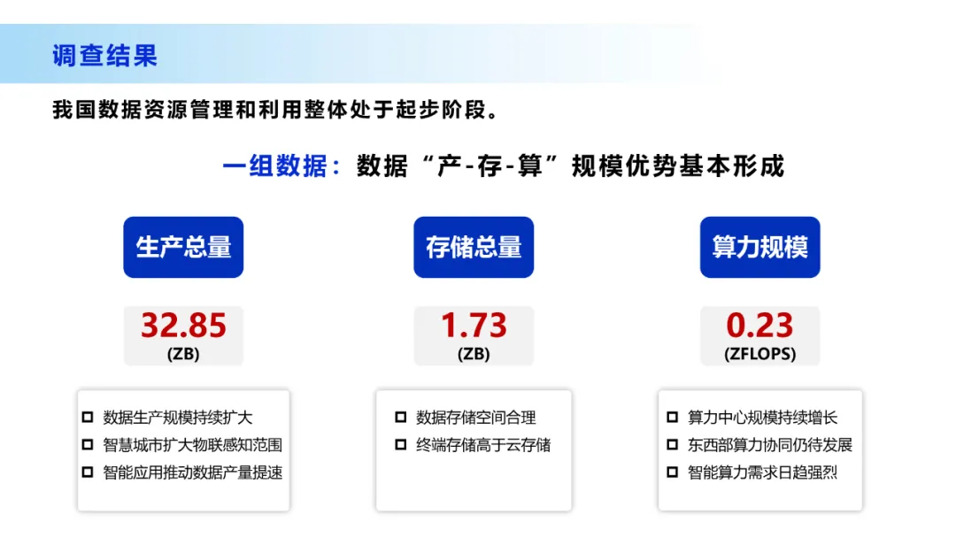調(diào)查發(fā)現(xiàn),我國數(shù)據(jù)資源管理和利用整體處于起步階段,數(shù)據(jù)資源“產(chǎn)-存-算”規(guī)模優(yōu)勢基本形成,數(shù)據(jù)“供-流-用”各環(huán)節(jié)主體逐漸豐富,海量數(shù)據(jù)和豐富場景優(yōu)勢潛力亟需釋放。