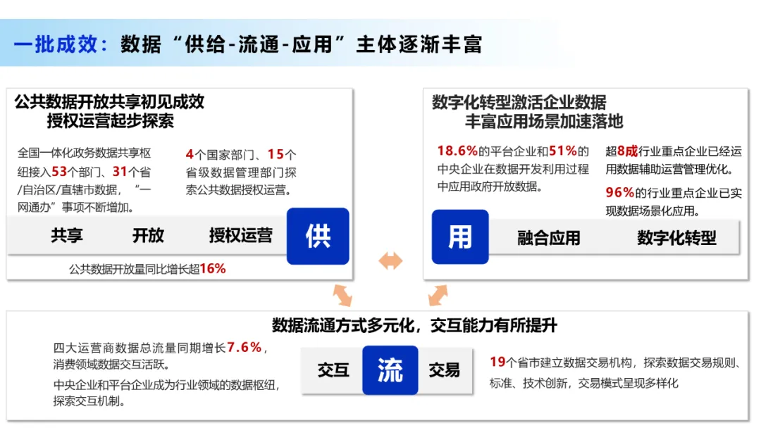 數(shù)據(jù)“供-流-用”各環(huán)節(jié)主體逐漸豐富。在“供”的方面,去年,我國公共數(shù)據(jù)開放量同比增長超16%,公共數(shù)據(jù)開放共享初見成效。多個地區(qū)的省級數(shù)據(jù)管理部門開始探索公共數(shù)據(jù)授權運營機制,通過整體統(tǒng)一授權、分領域分場景授權等多種方式,在優(yōu)化公共服務和推動創(chuàng)新發(fā)展方面取得了一定成效。