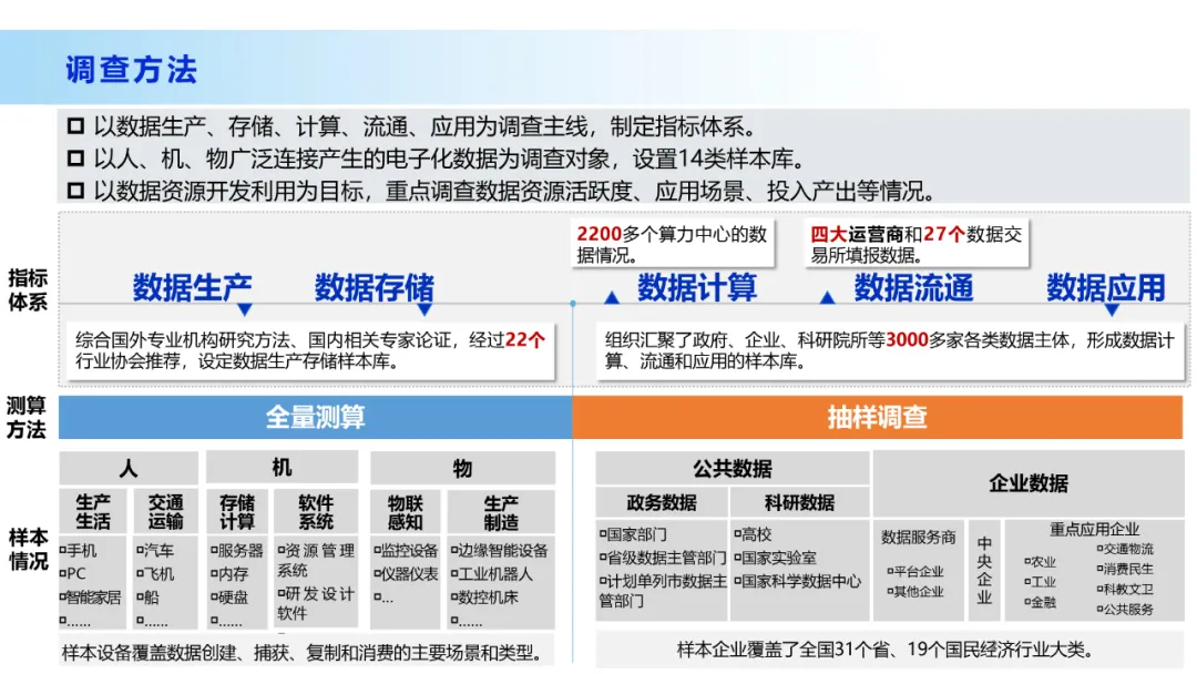 報告以3000多家調(diào)查樣本為基礎,以人、機、物廣泛連接產(chǎn)生的電子化數(shù)據(jù)為調(diào)查對象,采用全量測算和抽樣調(diào)查方法,通過數(shù)據(jù)分析、建模測算、結果校驗,較為全面地呈現(xiàn)了我國數(shù)據(jù)資源發(fā)展現(xiàn)狀。