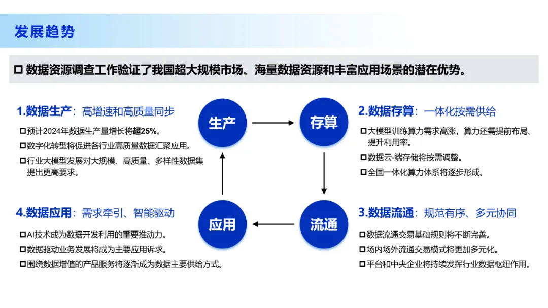 當前,數(shù)據(jù)資源日益成為衡量數(shù)字經(jīng)濟國際競爭力和軟實力的關鍵指標。全國數(shù)據(jù)資源調(diào)查作為一項基礎性工作,對摸清數(shù)據(jù)資源家底、加快數(shù)據(jù)開發(fā)利用、支撐政府精準施策和數(shù)字經(jīng)濟高質(zhì)量發(fā)展具有重要意義。未來,隨著數(shù)據(jù)技術不斷進步,基礎制度持續(xù)完善,數(shù)據(jù)資源發(fā)展將加速,數(shù)據(jù)生產(chǎn)規(guī)模將保持高速增長,預計2024年數(shù)據(jù)生產(chǎn)量增長將超25%,同時,存儲計算將向按需供給發(fā)展,數(shù)據(jù)流通將向規(guī)范有序、多元協(xié)同發(fā)展,數(shù)據(jù)開發(fā)利用將向需求牽引、智能驅動發(fā)展。
