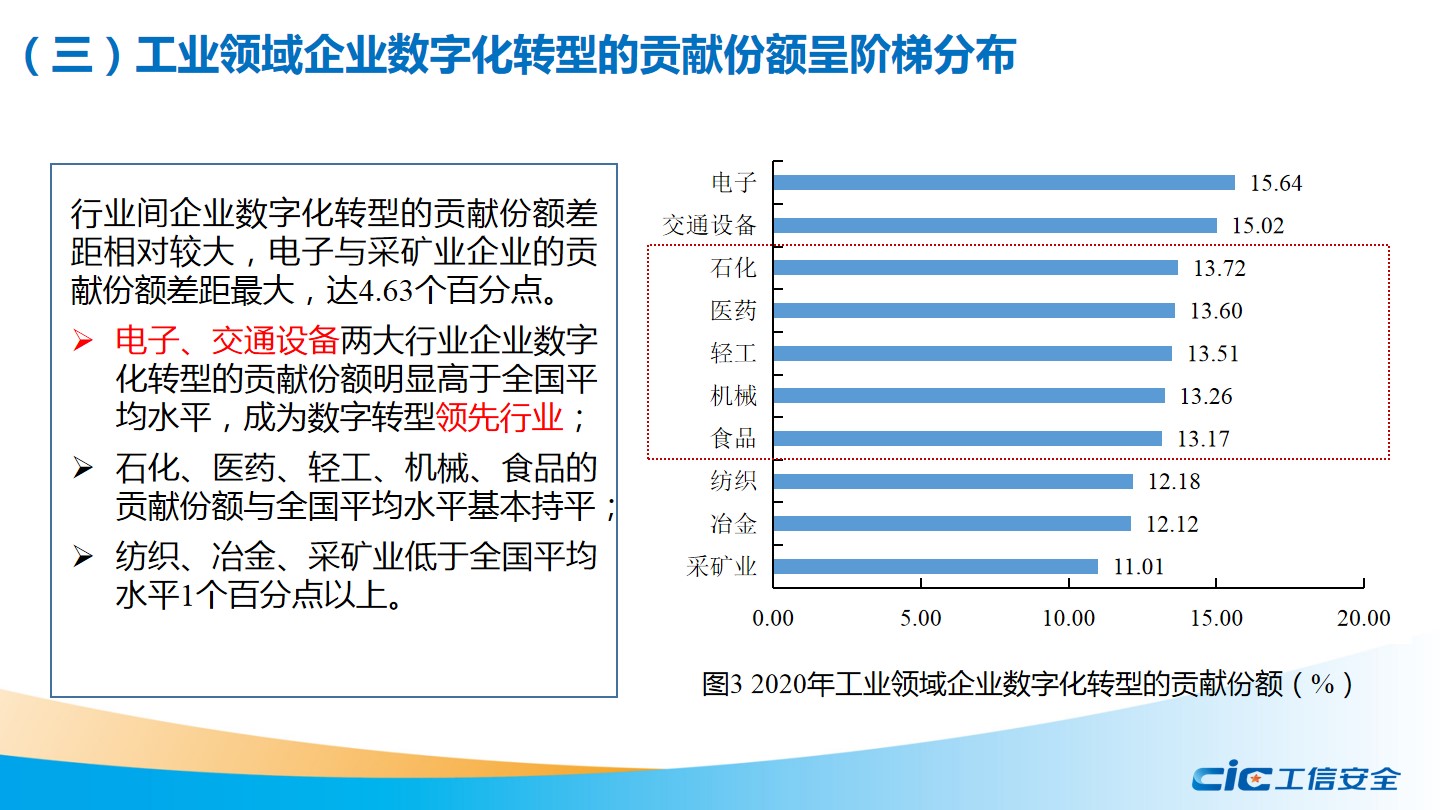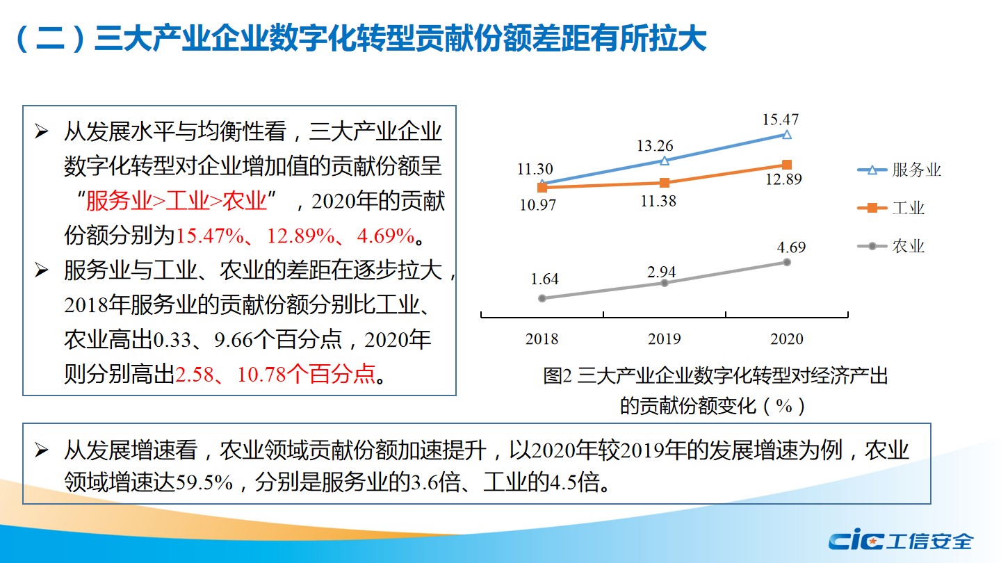 本報(bào)告測(cè)算了我國(guó)企業(yè)數(shù)字化轉(zhuǎn)型發(fā)展水平,分析了領(lǐng)先行業(yè)企業(yè)數(shù)字化轉(zhuǎn)型的實(shí)踐經(jīng)驗(yàn),提出未來(lái)發(fā)展建議。報(bào)告發(fā)現(xiàn),我國(guó)企業(yè)數(shù)字化轉(zhuǎn)型對(duì)經(jīng)濟(jì)產(chǎn)出的貢獻(xiàn)份額逐年增長(zhǎng),2020年我國(guó)企業(yè)數(shù)字化轉(zhuǎn)型對(duì)企業(yè)增加值的貢獻(xiàn)份額為13.31%,較2018年上升了2.23個(gè)百分點(diǎn),預(yù)計(jì)未來(lái)十年內(nèi)企業(yè)數(shù)字化轉(zhuǎn)型帶來(lái)的GDP增量將達(dá)到13.88萬(wàn)億元。三大產(chǎn)業(yè)企業(yè)數(shù)字化轉(zhuǎn)型貢獻(xiàn)份額的差距有所拉大,2020年服務(wù)業(yè)、工業(yè)、農(nóng)業(yè)企業(yè)的貢獻(xiàn)份額分別為15.47%、12.89%、4.69%。工業(yè)領(lǐng)域企業(yè)數(shù)字化轉(zhuǎn)型的貢獻(xiàn)份額呈階梯分布,電子、交通設(shè)備兩大行業(yè)企業(yè)數(shù)字化轉(zhuǎn)型的貢獻(xiàn)份額最高,分別達(dá)到15.64%、15.02%,成為數(shù)字轉(zhuǎn)型領(lǐng)先行業(yè)。對(duì)于數(shù)字化轉(zhuǎn)型領(lǐng)先行業(yè)的企業(yè)來(lái)說(shuō),高層領(lǐng)導(dǎo)和戰(zhàn)略規(guī)劃是第一要?jiǎng)?wù),設(shè)備改造和采銷線上化是切入點(diǎn),產(chǎn)品創(chuàng)新與協(xié)同是重要牽引力。下一步,應(yīng)精準(zhǔn)推進(jìn)企業(yè)數(shù)字化轉(zhuǎn)型,增強(qiáng)數(shù)字化轉(zhuǎn)型服務(wù)供給,加大中小微企業(yè)數(shù)字化轉(zhuǎn)型支持力度,推動(dòng)企業(yè)利用數(shù)字化轉(zhuǎn)型增強(qiáng)發(fā)展韌性。
