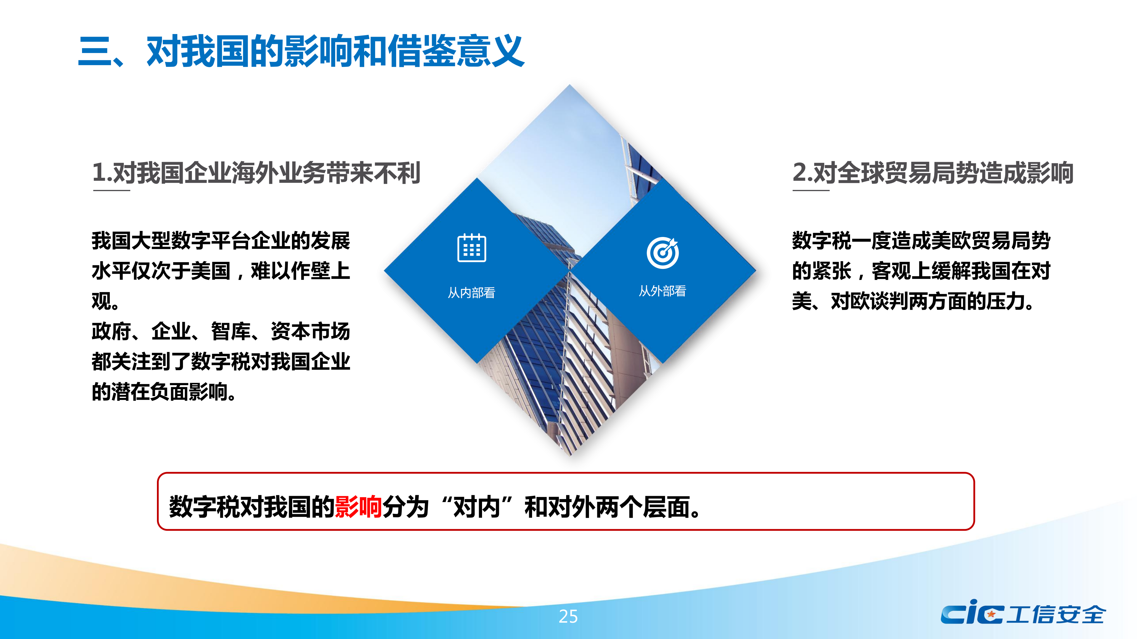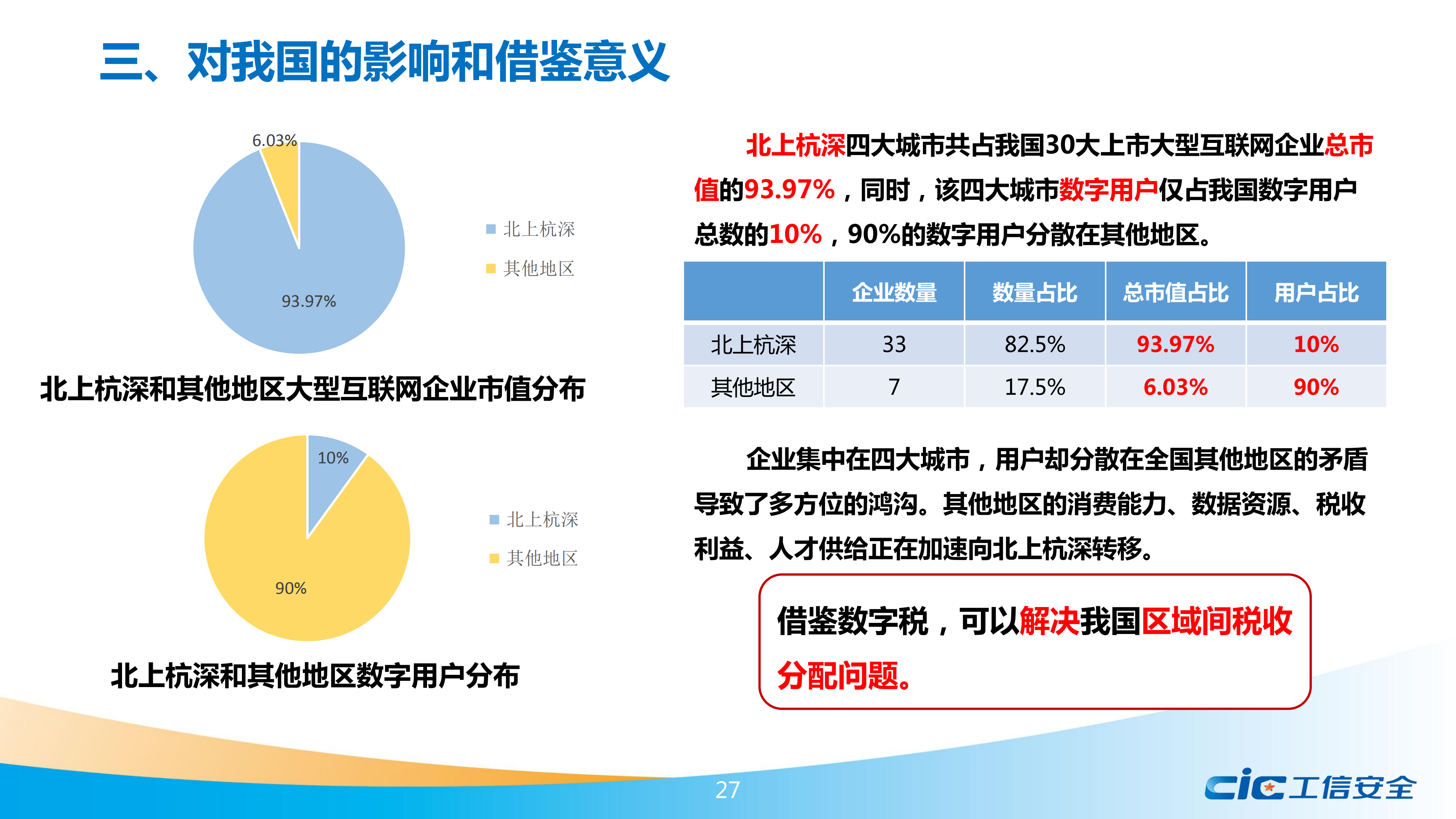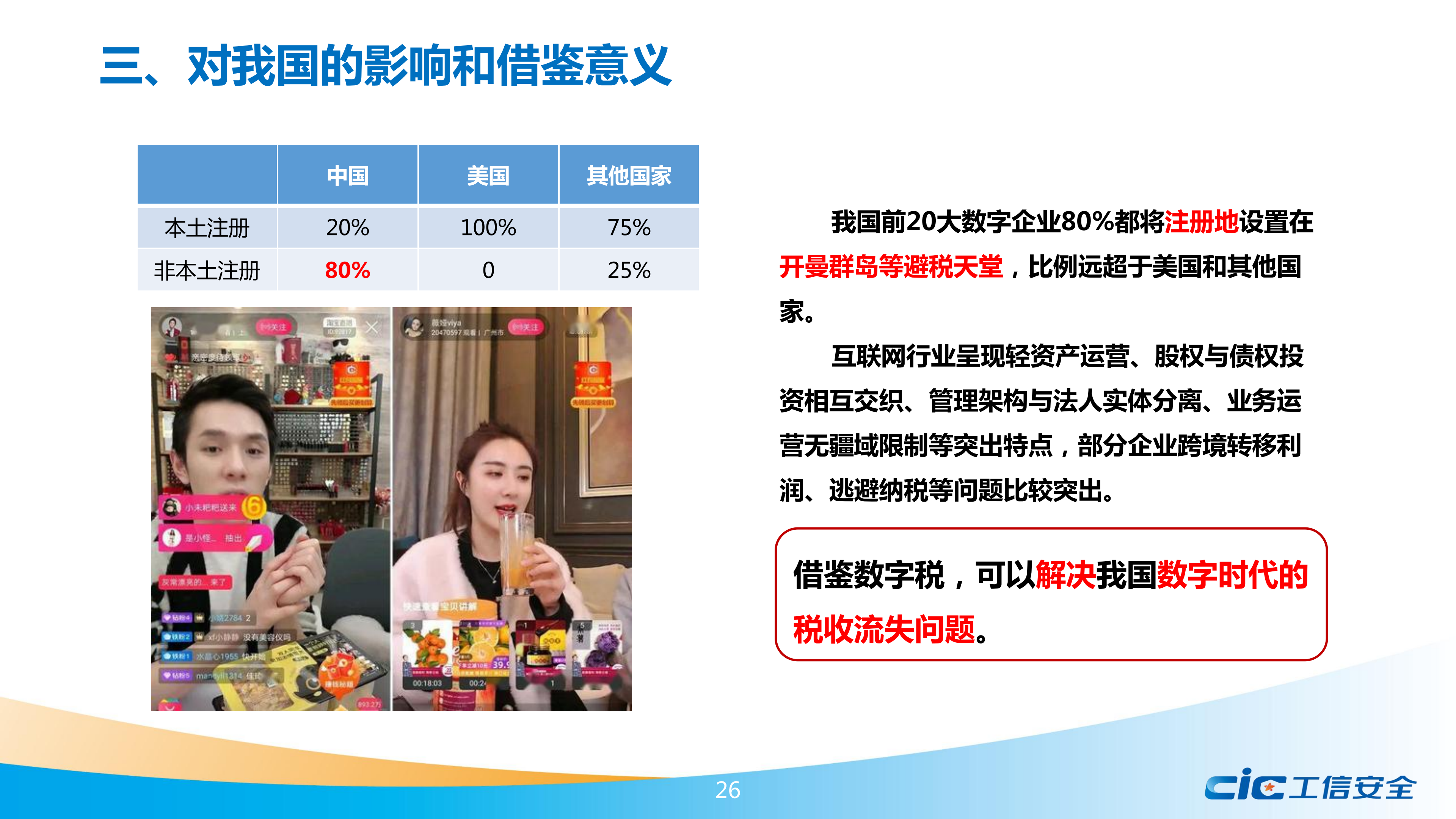 報告認(rèn)為,數(shù)字稅對我國有較大的影響和借鑒意義。從內(nèi)部看,數(shù)字稅對我國企業(yè)有潛在負(fù)面影響,國外政府、企業(yè)、智庫、資本市場都關(guān)注到數(shù)字稅對我國海外業(yè)務(wù)可能帶來的不利。從外部看,數(shù)字稅對全球貿(mào)易局勢造成影響,一定程度上影響到有關(guān)國家對華經(jīng)貿(mào)談判的走向。同時,隨著數(shù)字平臺快速發(fā)展,我國國內(nèi)也存在稅收流失問題和區(qū)域間稅收分配不平衡問題,值得借鑒數(shù)字稅的有關(guān)經(jīng)驗(yàn)。