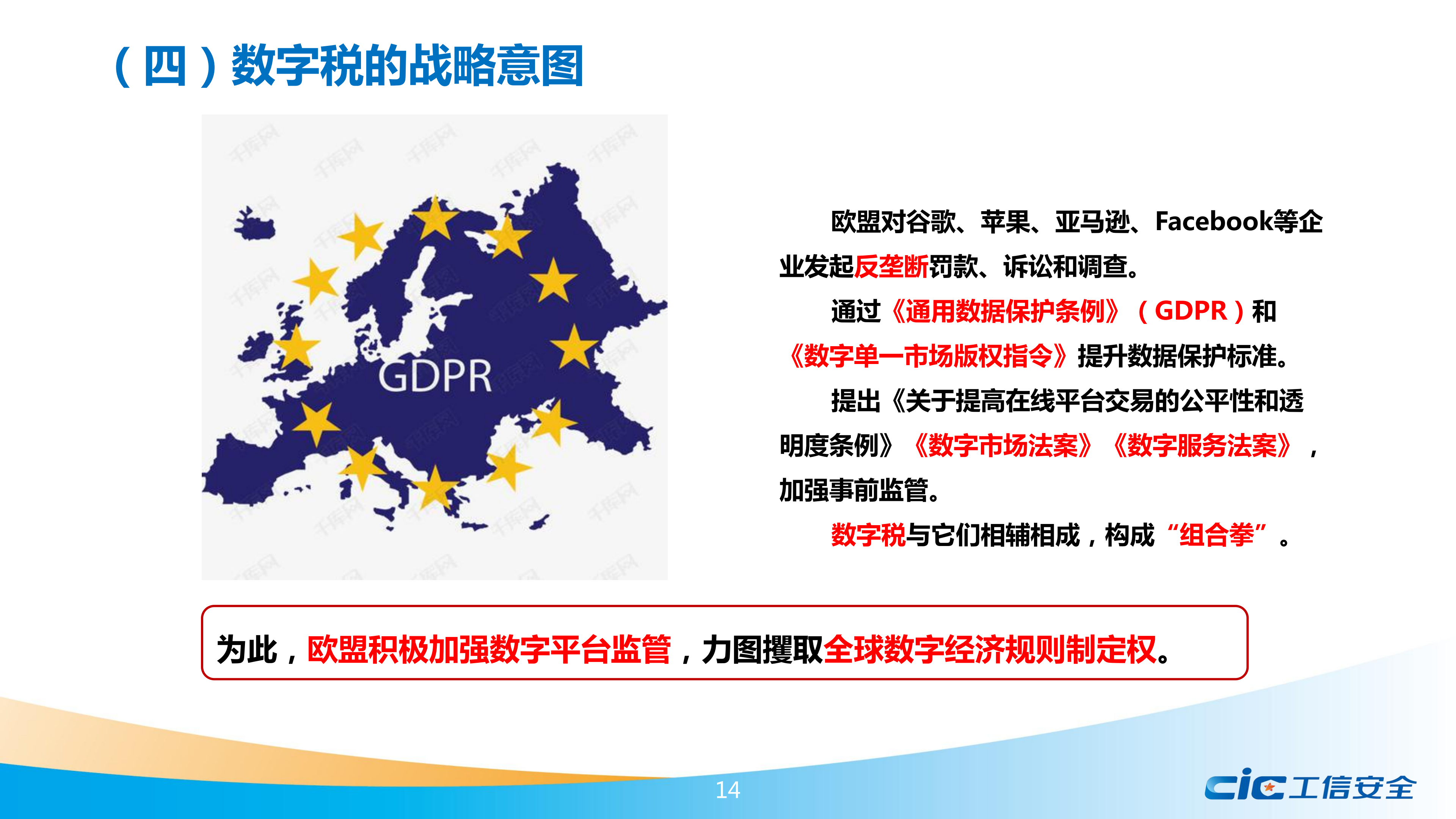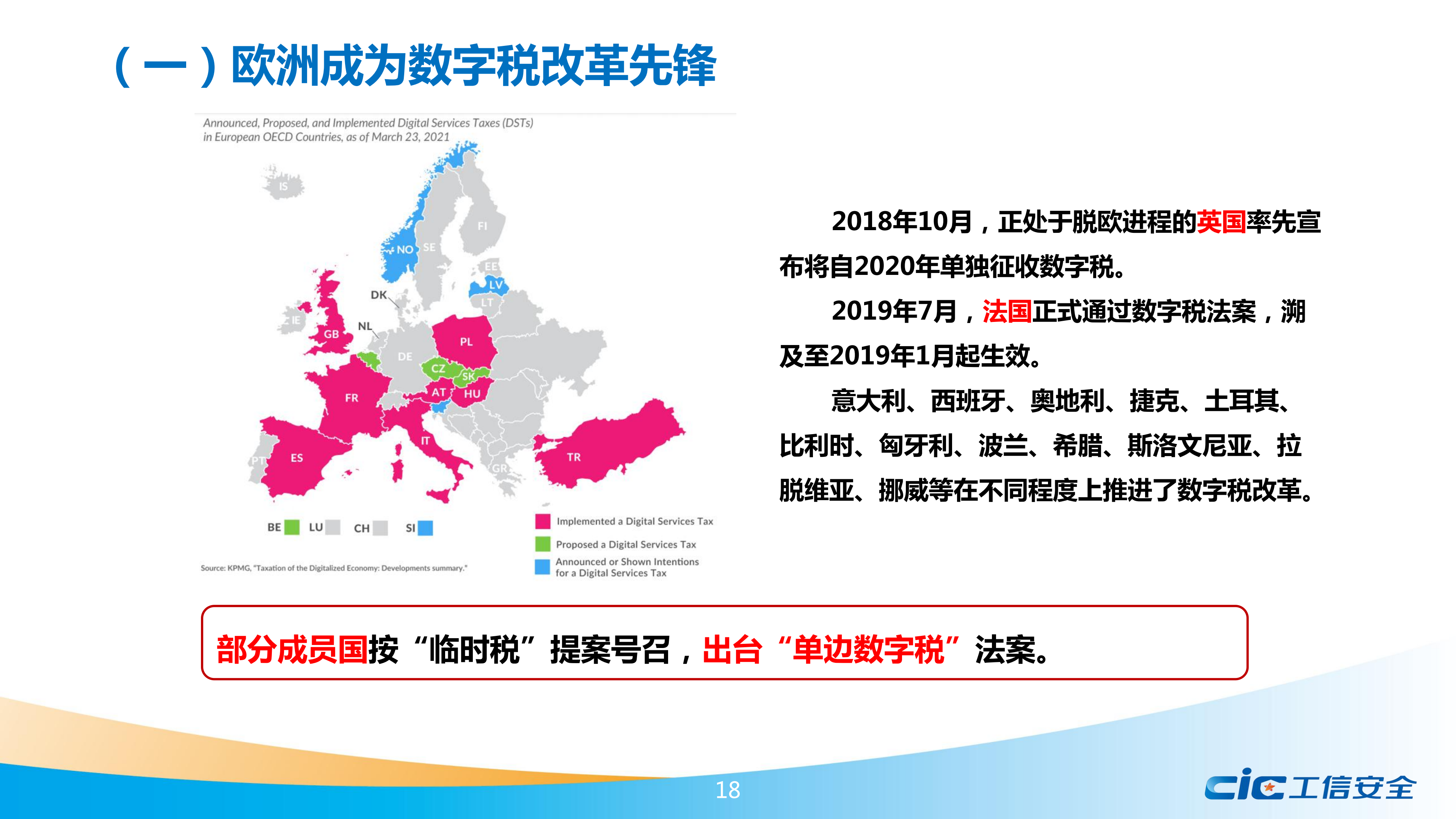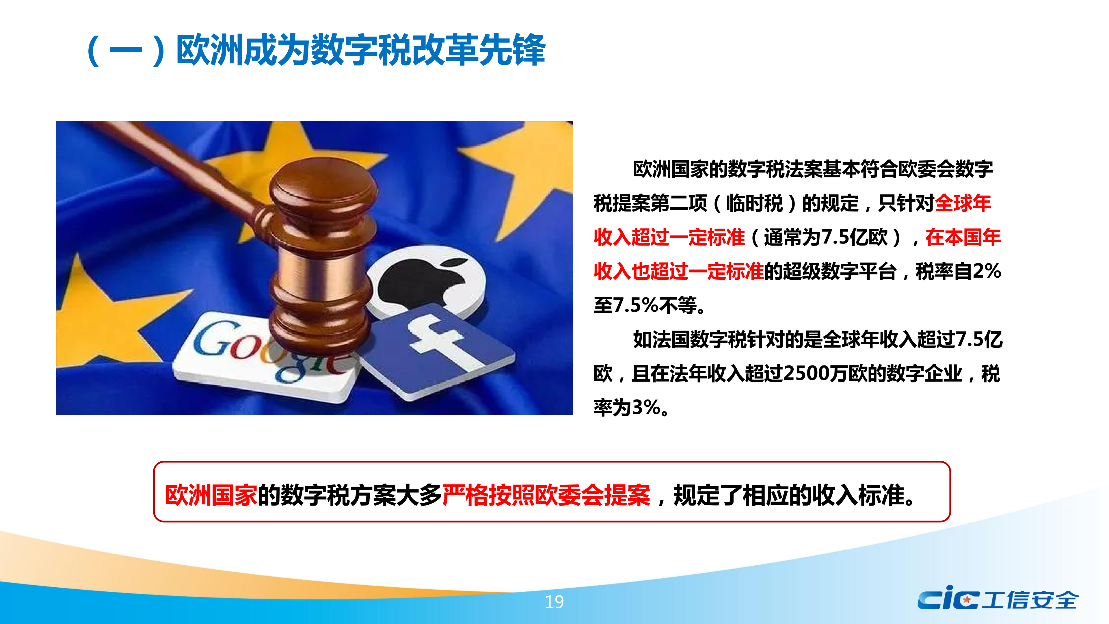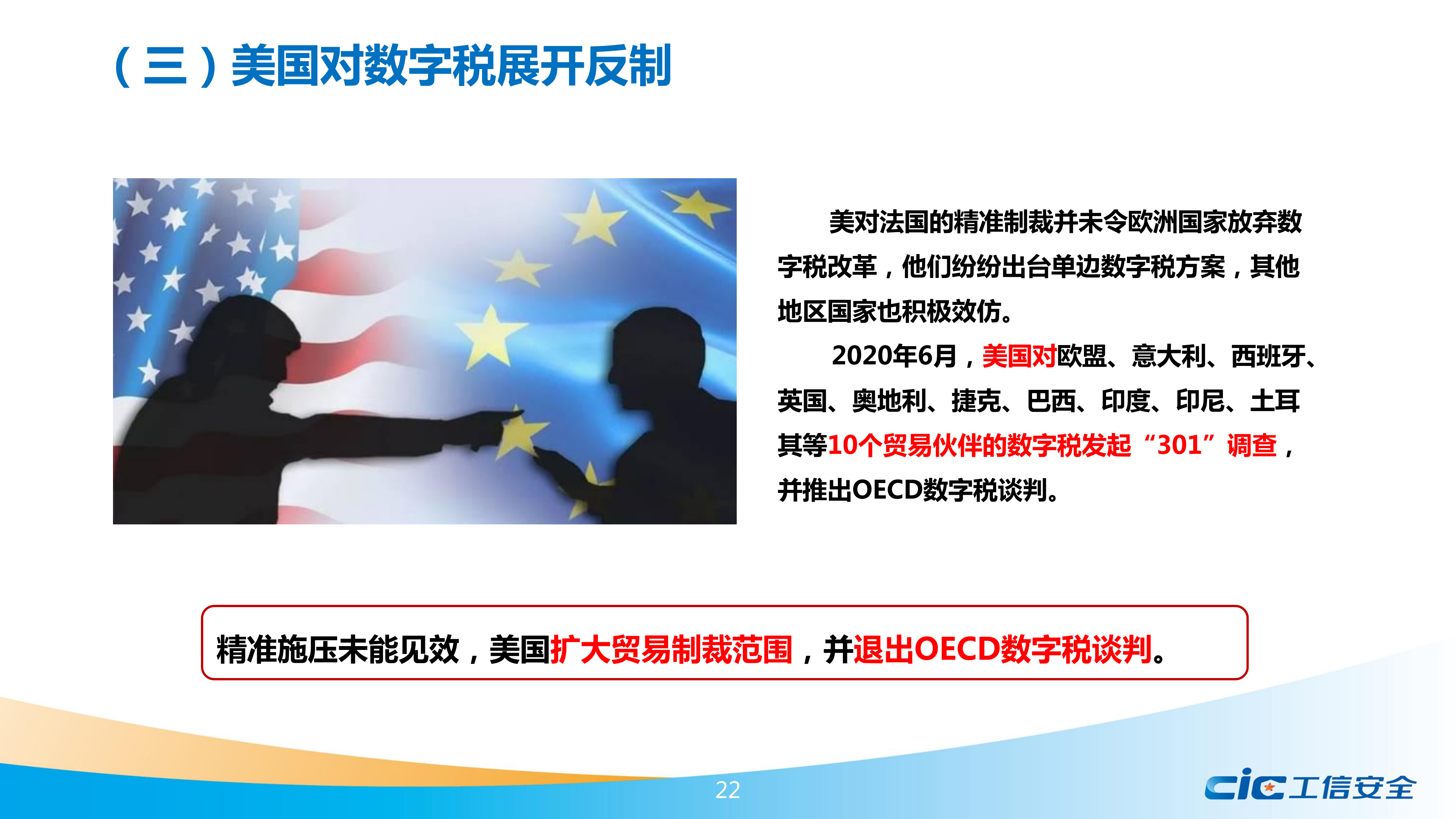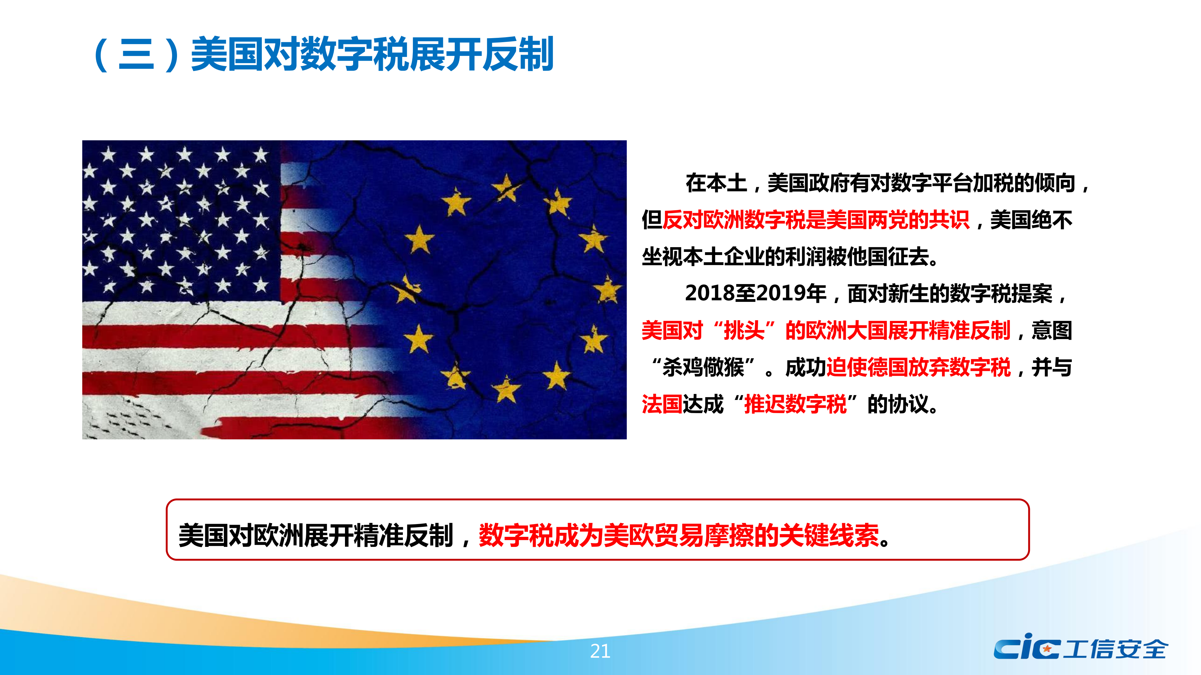 報告提出,數(shù)字稅由歐盟首先發(fā)起,主要針對谷歌、蘋果、Facebook等美國企業(yè),引發(fā)全球數(shù)十個經(jīng)濟(jì)體的效仿和美國的關(guān)稅制裁,是美歐貿(mào)易摩擦的關(guān)鍵線索。報告詳細(xì)介紹了歐盟及歐洲大國推進(jìn)數(shù)字稅的進(jìn)程,分別分析了其他地區(qū)國家效仿歐盟提出的數(shù)字稅方案,跟蹤梳理了歷年來美國對數(shù)字稅采取的反制措施,介紹了OECD主導(dǎo)下全球數(shù)字稅談判的有關(guān)情況。