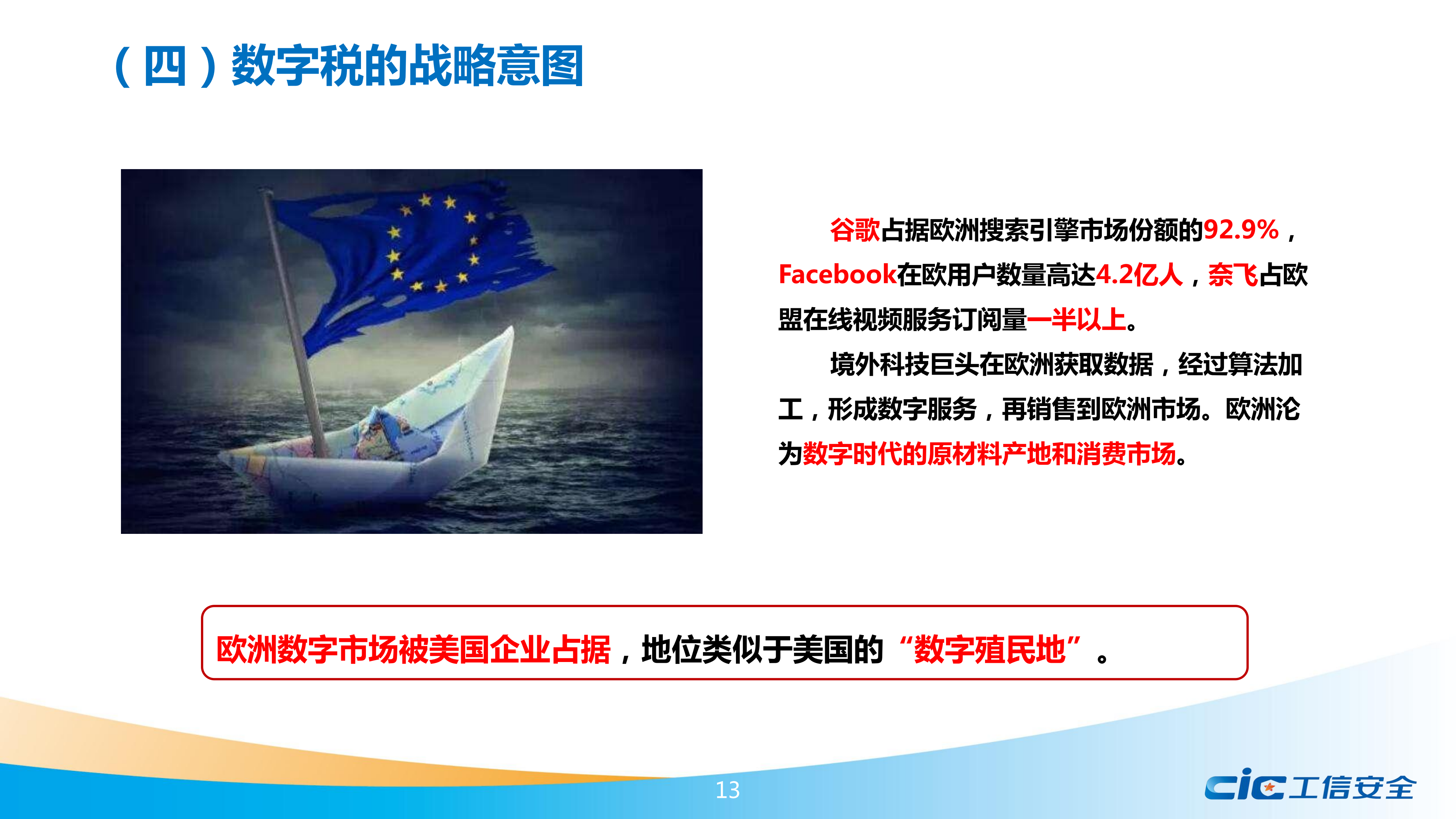 報告從理論基礎(chǔ)、現(xiàn)實(shí)背景、規(guī)則體系、戰(zhàn)略意圖等四個方面分析了數(shù)字稅的概念。報告認(rèn)為,平臺企業(yè)價值創(chuàng)造的根本,在于對用戶數(shù)據(jù)的采集、傳輸、存儲、分析,由此可以實(shí)現(xiàn)算法推薦,使供需雙方精準(zhǔn)匹配。用戶數(shù)據(jù)在價值創(chuàng)造中的關(guān)鍵作用,構(gòu)成了數(shù)字稅的理論基礎(chǔ)。跨國數(shù)字平臺有效利用傳統(tǒng)稅制的漏洞,造成大量稅收流失,是數(shù)字稅的現(xiàn)實(shí)背景。歐盟數(shù)字稅提案、OECD“雙支柱”計劃、聯(lián)合國“雙邊稅收協(xié)定范本”是當(dāng)前全球數(shù)字稅最主要的單邊、多邊、雙邊規(guī)則。歐盟內(nèi)部缺少全球領(lǐng)先的數(shù)字平臺企業(yè),為捍衛(wèi)本土市場,積極加強(qiáng)數(shù)字平臺監(jiān)管,是其提出數(shù)字稅的戰(zhàn)略意圖。