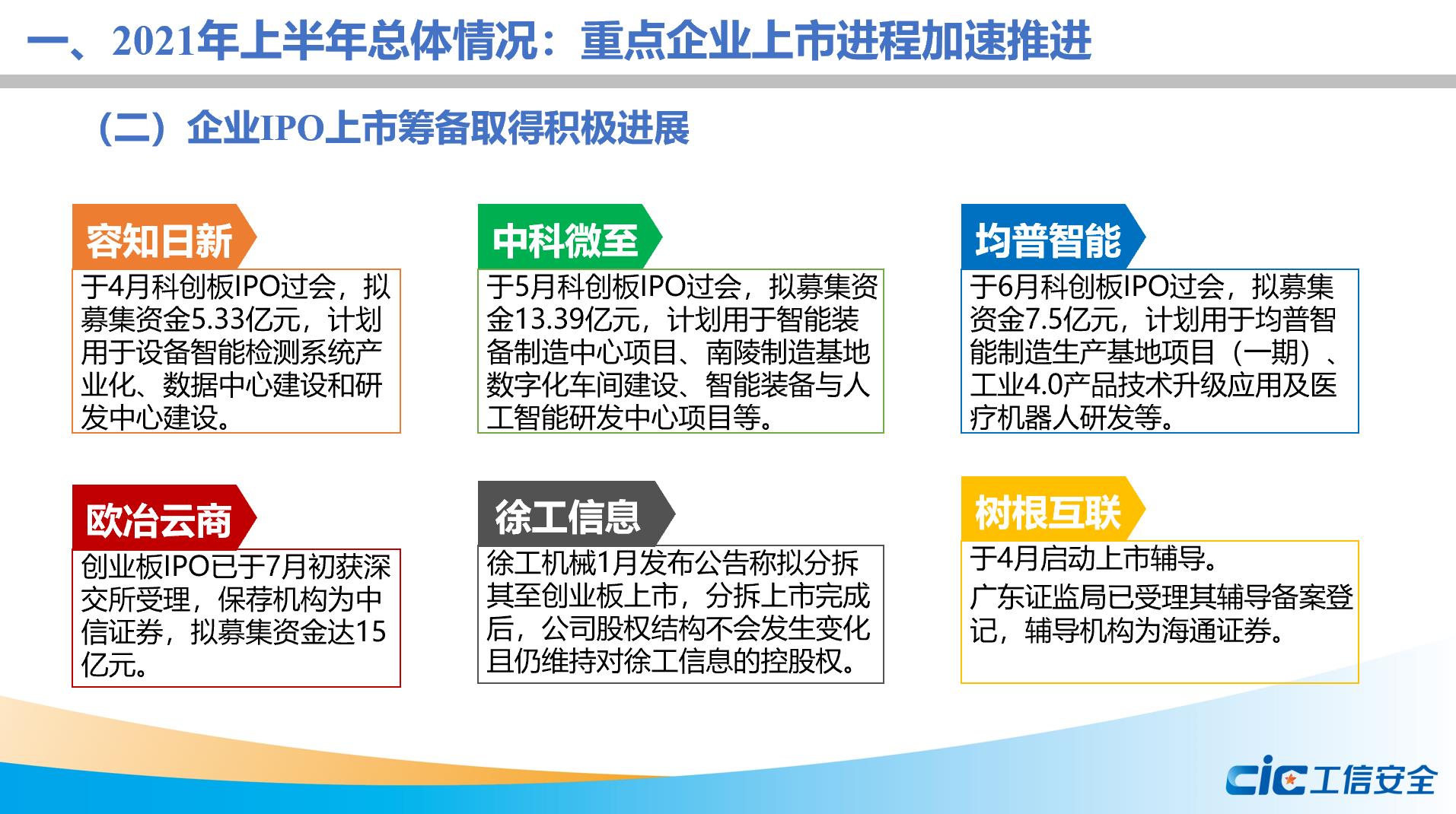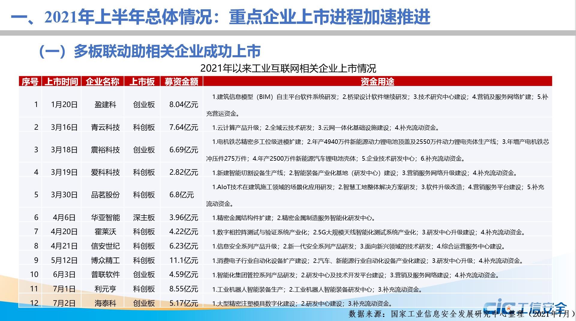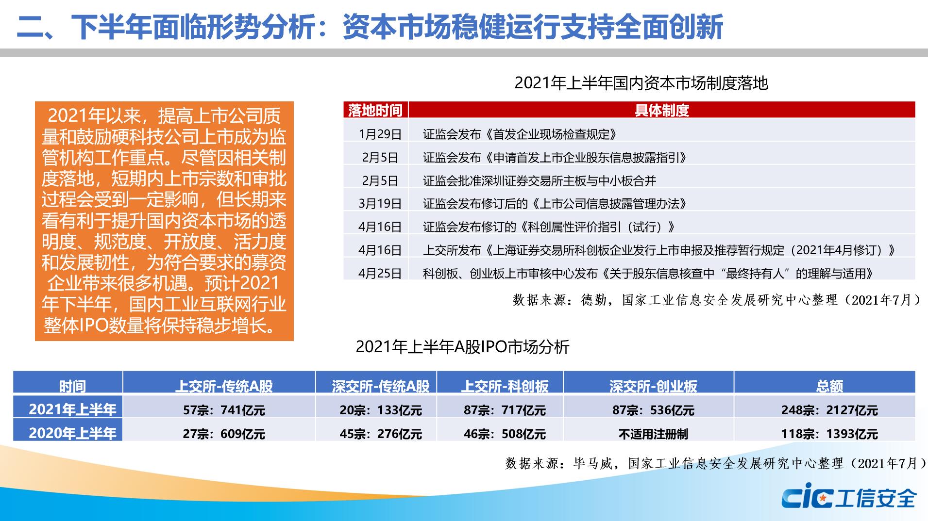 報告認為,當前我國工業互聯網發展面臨政策利好持續釋放、資本市場穩健運行、數據安全法律體系愈加完善等有利條件。2021年下半年,科創板和創業板在服務科技創新方面的作用將繼續凸顯,從而為處于不同發展階段、具備不同競爭優勢的工業互聯網企業提供相應的資金支持。受此帶動,國內工業互聯網行業整體IPO數量也將保持穩步增長。