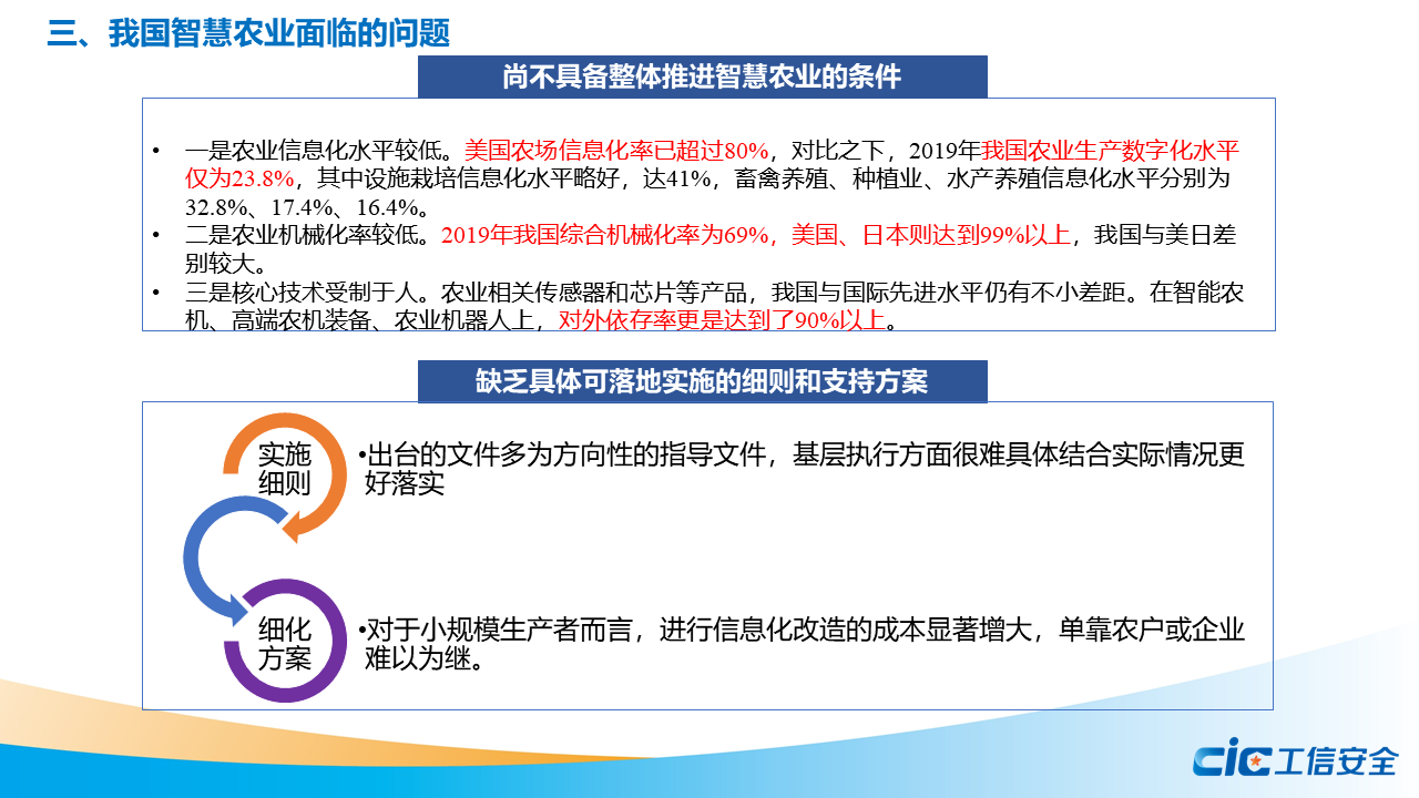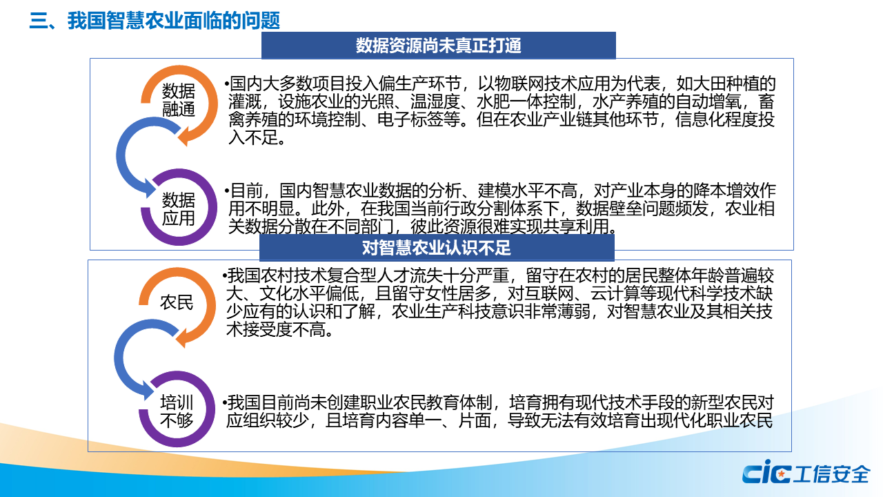 報告認為,伴隨網絡扶貧、電信普遍服務、電子商務進農村等措施落地實施,我國智慧農業發展基礎不斷夯實,農村光纖和4G覆蓋率均超過OECD平均水平,農業物聯網、農業大數據得以廣泛應用。但總體上來看,我國智慧農業仍處于起步階段,仍存在明顯短板,尚不具備整體推進智慧農業的條件,缺乏具體可落地實施的細則和支持方案,數據資源尚未完全打通,對于智慧農業本身認知仍有不足。