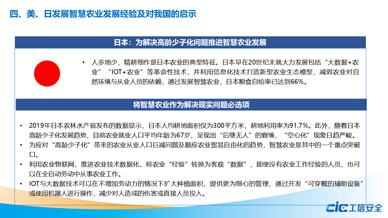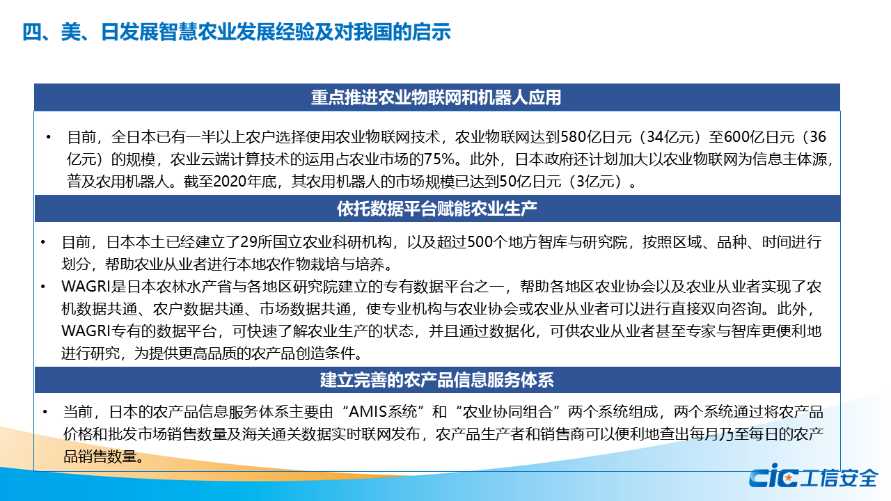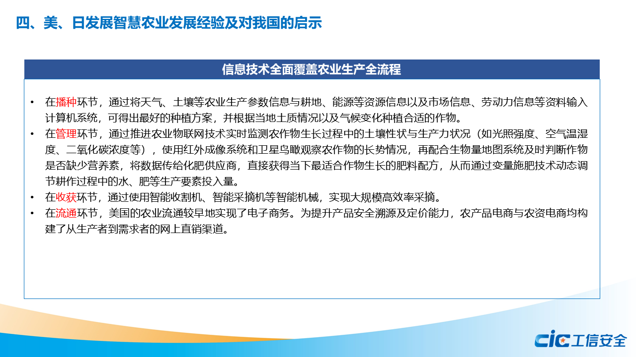 報告提出,美、日兩國結合自身情況積累了豐富的智慧農業發展經驗。美國通過全面推進信息技術與農業全鏈條融合發展,在種植、管理、收獲、流通等環節均通過物聯網、農業大數據、電子商務等措施,打造了全閉環式的智慧農業發展模式。日本農業面臨從業人口老、后繼無人等困境,通過推進智慧農業發展,利用信息化技術打造新型農業生態,大大降低農業對自然環境與從業人員的依賴。為促進我國智慧農業更好發展,仍需要充分結合我國農業發展特點,打造相應的農業智能裝備,打通農業數據壁壘。