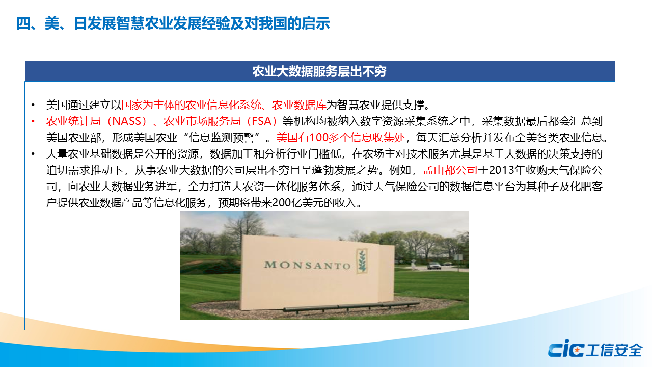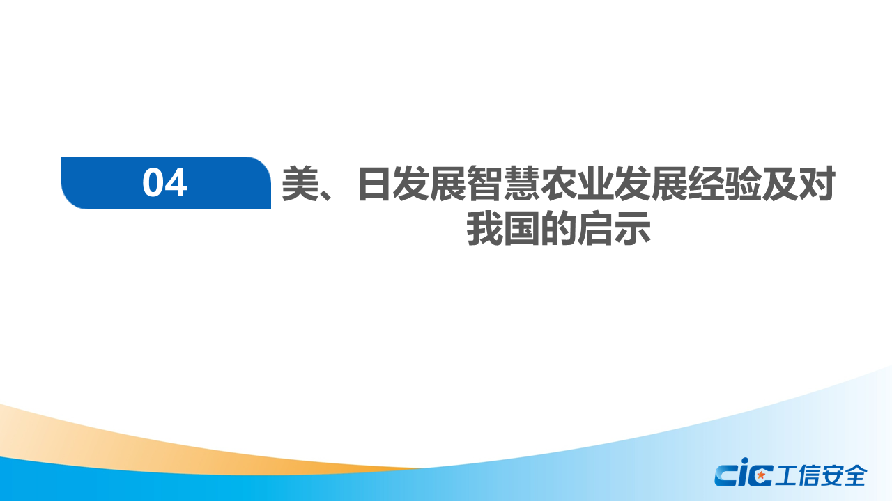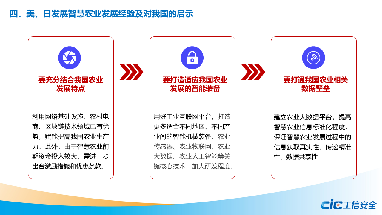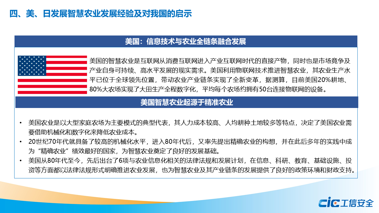 報告提出,美、日兩國結合自身情況積累了豐富的智慧農業發展經驗。美國通過全面推進信息技術與農業全鏈條融合發展,在種植、管理、收獲、流通等環節均通過物聯網、農業大數據、電子商務等措施,打造了全閉環式的智慧農業發展模式。日本農業面臨從業人口老、后繼無人等困境,通過推進智慧農業發展,利用信息化技術打造新型農業生態,大大降低農業對自然環境與從業人員的依賴。為促進我國智慧農業更好發展,仍需要充分結合我國農業發展特點,打造相應的農業智能裝備,打通農業數據壁壘。