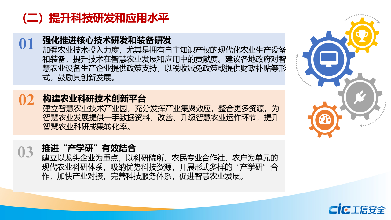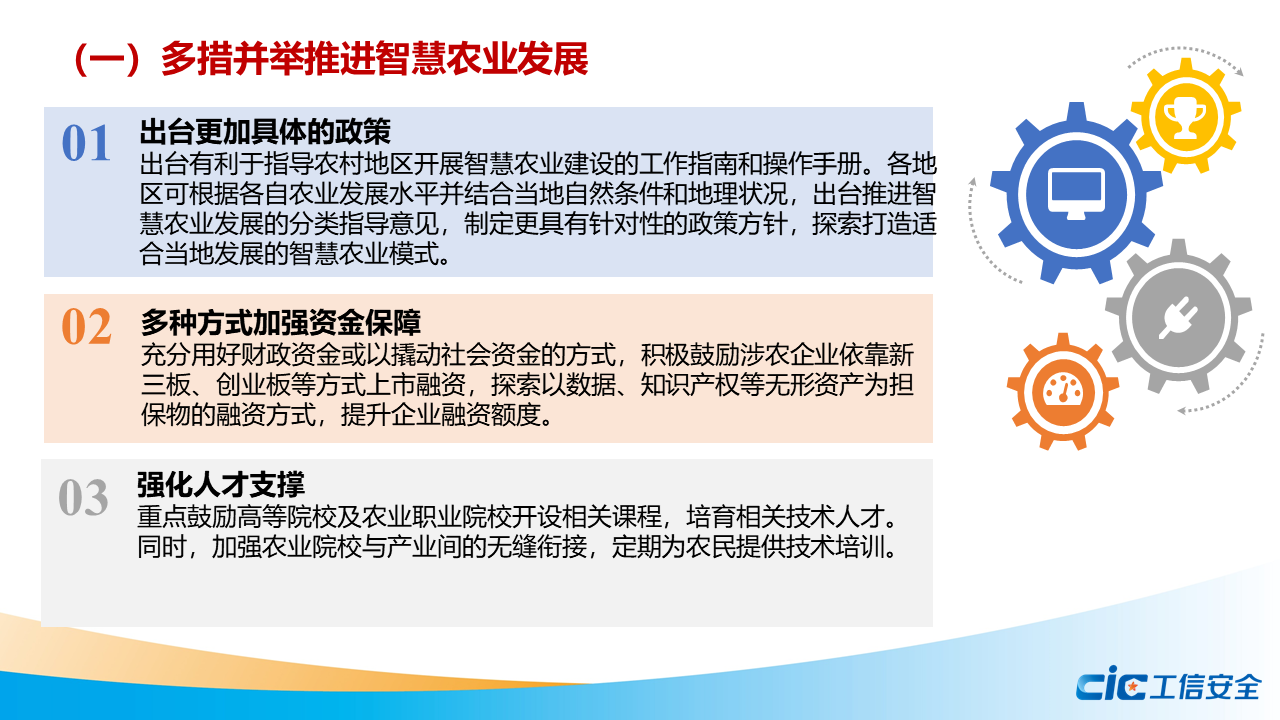 報告建議,借鑒國外經驗,一是多措并舉推進智慧農業發展,出臺更加具體政策能夠幫助當地打造適合的智慧農業發展模式,加強資金保障,為智慧農業發展提供必備資金,強化人才支撐,為智慧農業發展及創新提供充足的人才資源。二是提升農業科技研發和應用水平,強化推進核心技術研發和裝備研發,構建農業科研技術創新平臺,推進“產學研”有效結合。三是強化強化新基建和國產裝備應用能力,加快農業新基建建設,引導農戶使用國產農業機械和裝備,完善農業公共信息服務體系。四是做好宣傳和推廣,及時總結推廣智慧農業先進經驗,加強交流,營造全社會關心智慧農業發展的良好氛圍。
