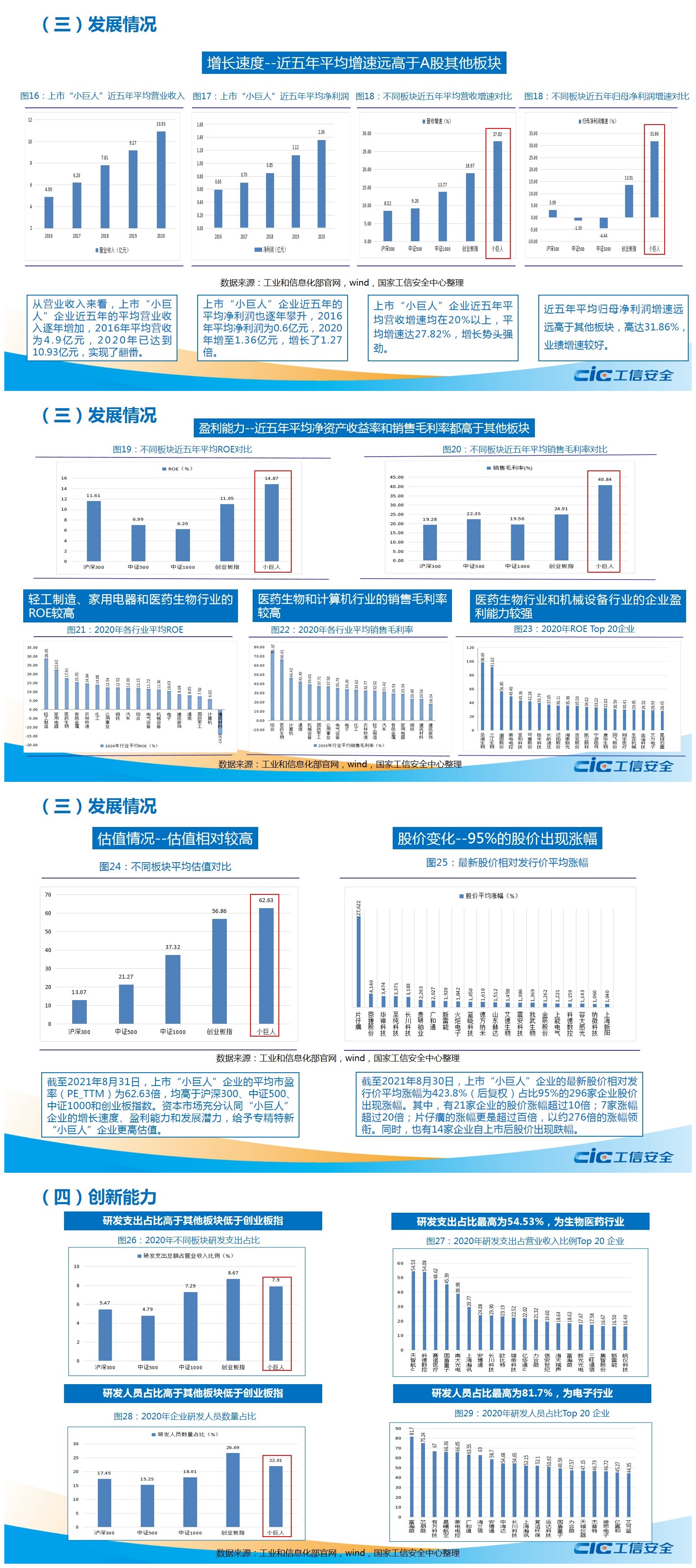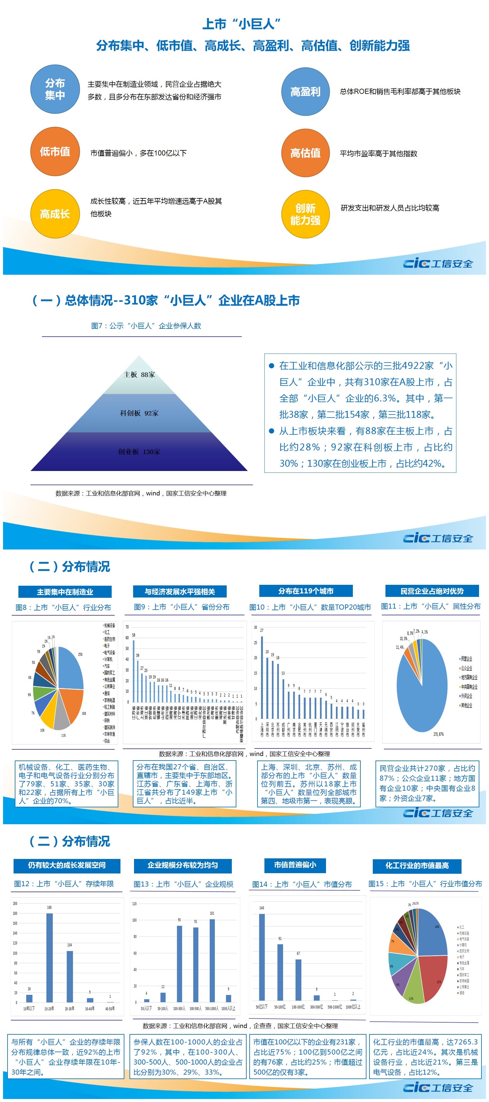 報告對我國公示的4922家專精特新“小巨人”企業進行了全面分析,并進一步聚焦310家在A股上市的“小巨人”企業,依據其披露的財務數據做了更深入的分析,發現這些企業具有分布集中、低市值、高成長、高盈利、高估值、創新能力強的顯著特征和優勢。同時,結合我國“小巨人”企業的發展實際,梳理了目前培育及發展“專精特新”企業中還存在的一些問題,并提出了相應的政策建議。