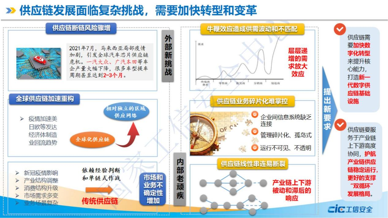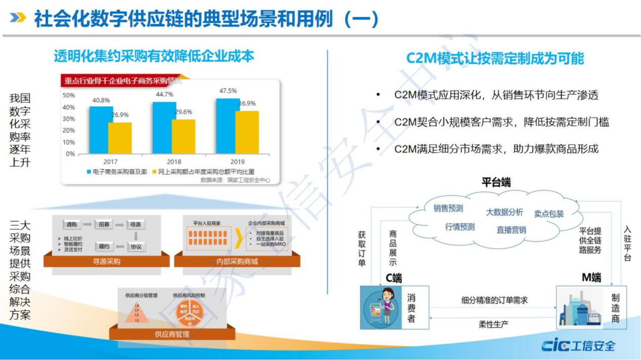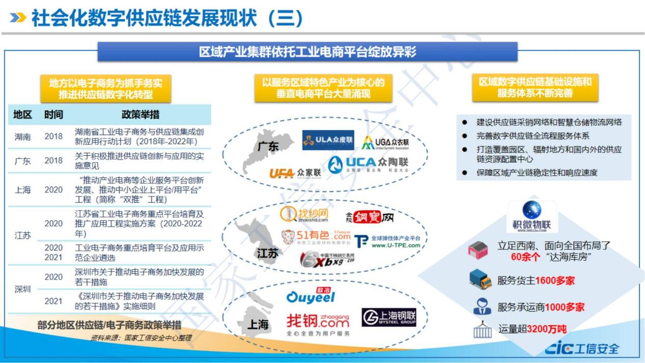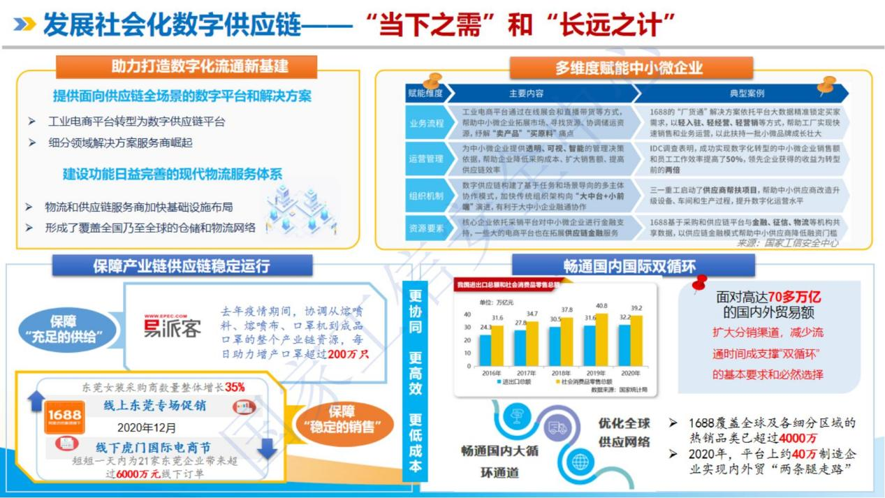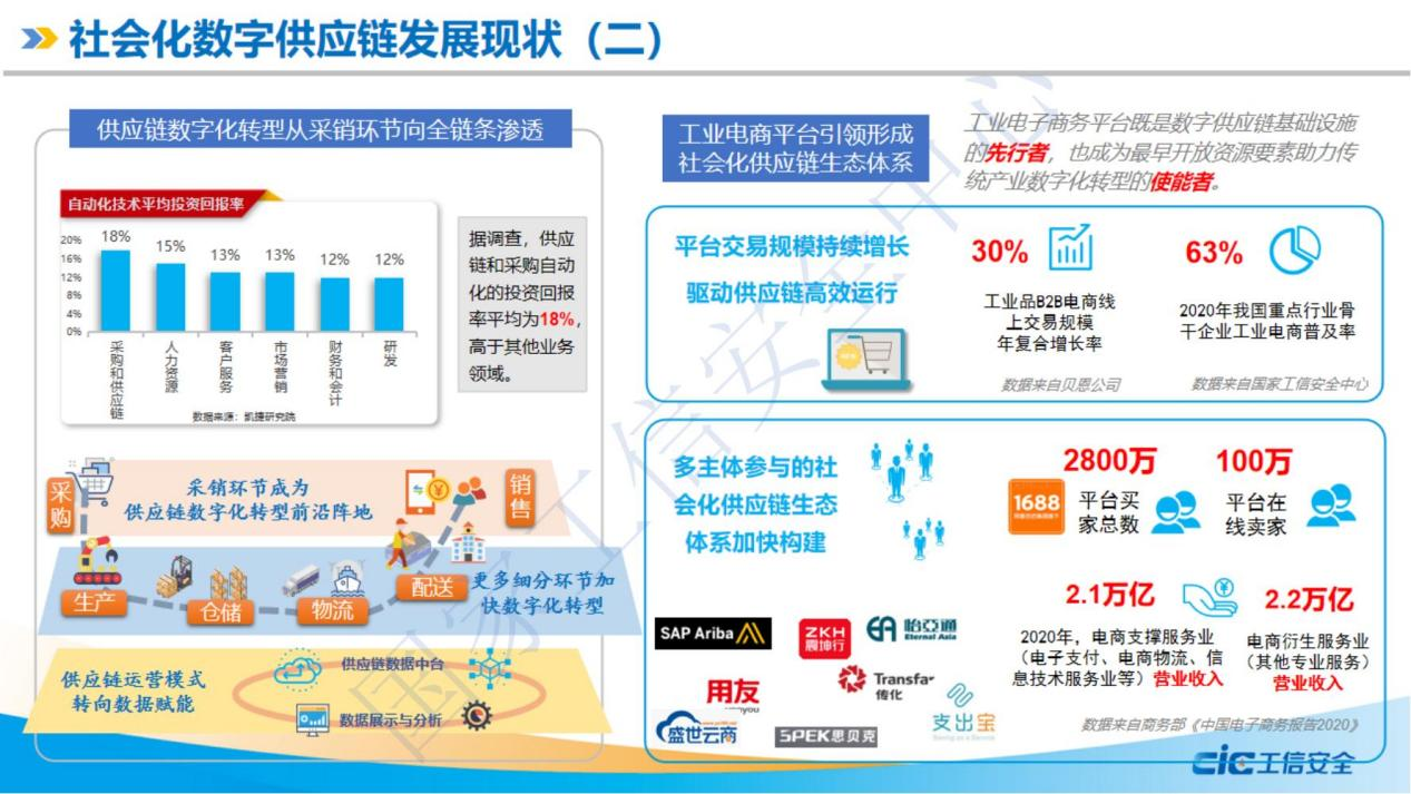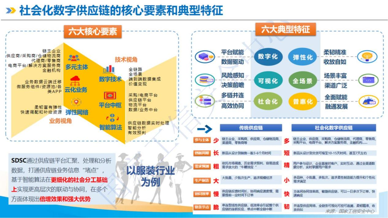 10月23日,在大灣區(qū)(深圳)數(shù)字供應(yīng)鏈峰會(huì)暨第三屆中國(guó)工業(yè)電子商務(wù)大會(huì)上,國(guó)家工業(yè)信息安全發(fā)展研究中心副主任何小龍發(fā)布《社會(huì)化數(shù)字供應(yīng)鏈全景圖》研究報(bào)告。 報(bào)告指出,在新興數(shù)字技術(shù)、平臺(tái)和解決方案的“組合拳”作用下,供應(yīng)鏈不再囿于單純的企業(yè)業(yè)務(wù)范疇,而是加快向數(shù)字化、社會(huì)化、生態(tài)化演進(jìn)。 報(bào)告首次對(duì)社會(huì)化數(shù)字供應(yīng)鏈的概念內(nèi)涵作了界定,認(rèn)為社會(huì)化數(shù)字供應(yīng)鏈?zhǔn)怯啥嘣黧w參與的,通過供應(yīng)鏈全流程數(shù)據(jù)共享和價(jià)值挖掘賦能行業(yè)和企業(yè),在此過程中所形成的一種“線上+線下”“物理+數(shù)字”的新型基礎(chǔ)設(shè)施和生產(chǎn)流通組織形態(tài)。 報(bào)告分別從技術(shù)和業(yè)務(wù)視角總結(jié)了社會(huì)化數(shù)字供應(yīng)鏈的六大要素,即數(shù)字技術(shù)、平臺(tái)中樞、智能算法以及多元主體、彈性網(wǎng)絡(luò)和云化業(yè)務(wù)。與傳統(tǒng)供應(yīng)鏈相比,社會(huì)化數(shù)字供應(yīng)鏈體現(xiàn)出數(shù)字化、可視化、社會(huì)化、彈性化、全場(chǎng)景及普惠化等六大特征。 報(bào)告認(rèn)為,加快社會(huì)化數(shù)字供應(yīng)鏈發(fā)展,不僅是當(dāng)前打造數(shù)字化流通新基建,賦能中小微企業(yè)“新基石”,更是關(guān)乎產(chǎn)業(yè)鏈供應(yīng)鏈穩(wěn)定和“雙循環(huán)”大局的“先手棋”。 從實(shí)踐來看,供應(yīng)鏈數(shù)字化轉(zhuǎn)型一般先從營(yíng)銷、采購等交易環(huán)節(jié)切入,逐步向供應(yīng)鏈全環(huán)節(jié)拓展,越來越多的數(shù)字技術(shù)已經(jīng)在供應(yīng)鏈中找到了落地場(chǎng)景,我國(guó)整體處于起步階段。工業(yè)電子商務(wù)平臺(tái)既是推動(dòng)數(shù)字供應(yīng)鏈發(fā)展的先行者,也成為助力傳統(tǒng)產(chǎn)業(yè)數(shù)字化轉(zhuǎn)型的使能者。 報(bào)告結(jié)合1688等平臺(tái)的典型做法,詳細(xì)展示了社會(huì)化數(shù)字供應(yīng)鏈的八類具體場(chǎng)景和用例。一是透明化集約采購有效降低企業(yè)成本,二是基于柔性生產(chǎn)的C2M模式讓按需定制成為可能,三是全渠道數(shù)字化營(yíng)銷創(chuàng)造廣闊市場(chǎng)空間,四是智慧物流全面提升供應(yīng)鏈效率,五是供應(yīng)鏈金融破解中小微企業(yè)融資難融資貴困局,六是跨境電商賦能企業(yè)提升企業(yè)供應(yīng)鏈全球化運(yùn)營(yíng)能力,七是打造特色產(chǎn)業(yè)集群強(qiáng)化產(chǎn)業(yè)鏈協(xié)作能力,八是構(gòu)建農(nóng)產(chǎn)品上行通路帶動(dòng)縣域經(jīng)濟(jì)發(fā)展。 當(dāng)前,社會(huì)化數(shù)字供應(yīng)鏈正推動(dòng)相關(guān)環(huán)節(jié)數(shù)字化走向縱深。然而,相對(duì)采銷環(huán)節(jié)數(shù)字化,要實(shí)現(xiàn)供應(yīng)鏈上下游主體間數(shù)據(jù)共享與協(xié)同的阻力更大、難度更高、進(jìn)展更緩慢,需要從供給側(cè)、應(yīng)用側(cè)、要素資源、生態(tài)體系和發(fā)展環(huán)境等方面共同發(fā)力,突破瓶頸。 下一步,中心將對(duì)社會(huì)化數(shù)字供應(yīng)鏈理論和實(shí)踐進(jìn)行更深入的跟蹤研究,也誠摯歡迎社會(huì)各界參與我們的交流和探討。