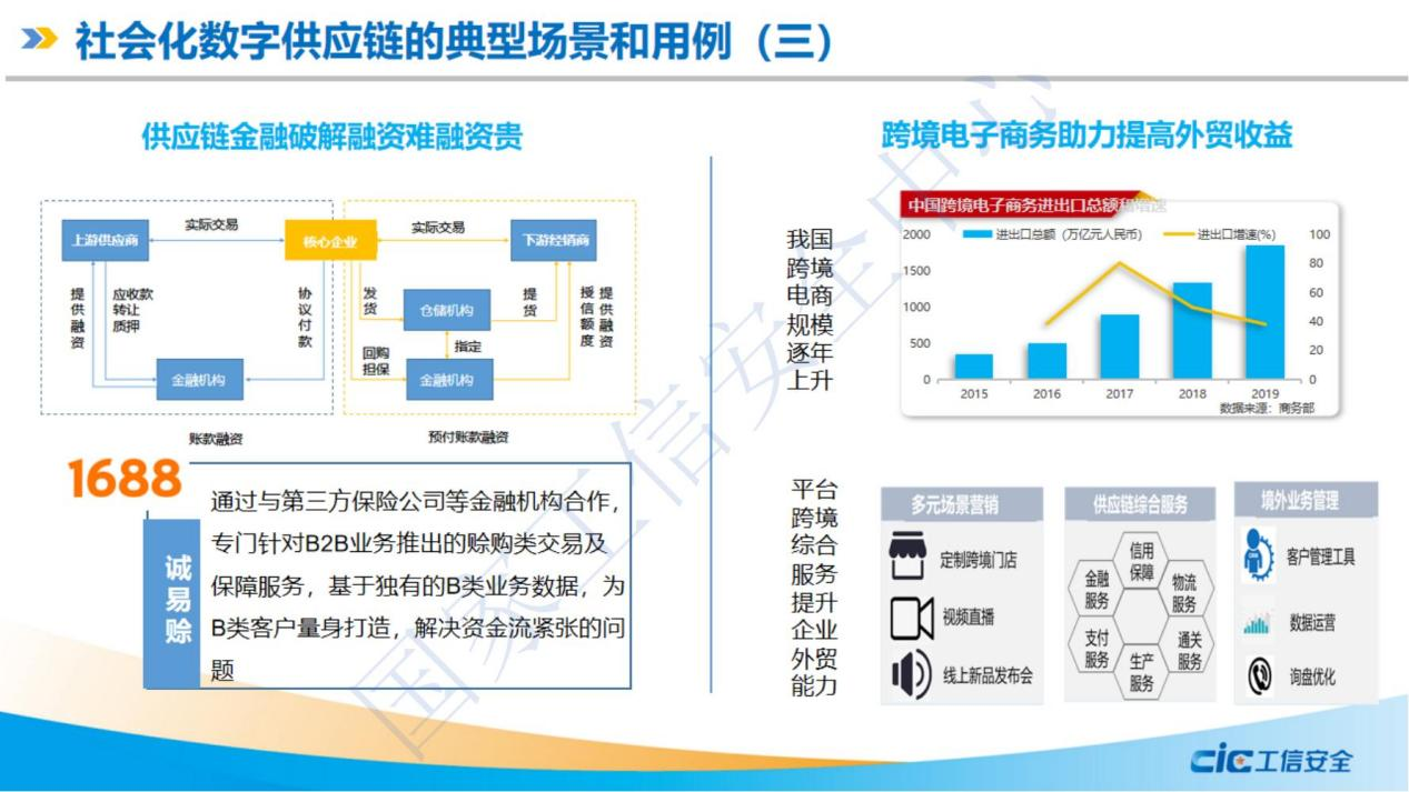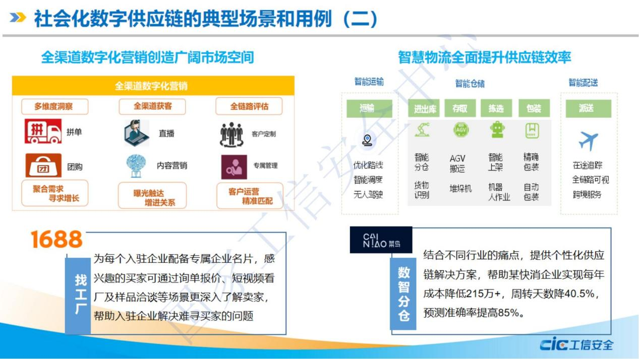 報(bào)告結(jié)合1688等平臺(tái)的典型做法,詳細(xì)展示了社會(huì)化數(shù)字供應(yīng)鏈的八類具體場(chǎng)景和用例。一是透明化集約采購有效降低企業(yè)成本,二是基于柔性生產(chǎn)的C2M模式讓按需定制成為可能,三是全渠道數(shù)字化營(yíng)銷創(chuàng)造廣闊市場(chǎng)空間,四是智慧物流全面提升供應(yīng)鏈效率,五是供應(yīng)鏈金融破解中小微企業(yè)融資難融資貴困局,六是跨境電商賦能企業(yè)提升企業(yè)供應(yīng)鏈全球化運(yùn)營(yíng)能力,七是打造特色產(chǎn)業(yè)集群強(qiáng)化產(chǎn)業(yè)鏈協(xié)作能力,八是構(gòu)建農(nóng)產(chǎn)品上行通路帶動(dòng)縣域經(jīng)濟(jì)發(fā)展。