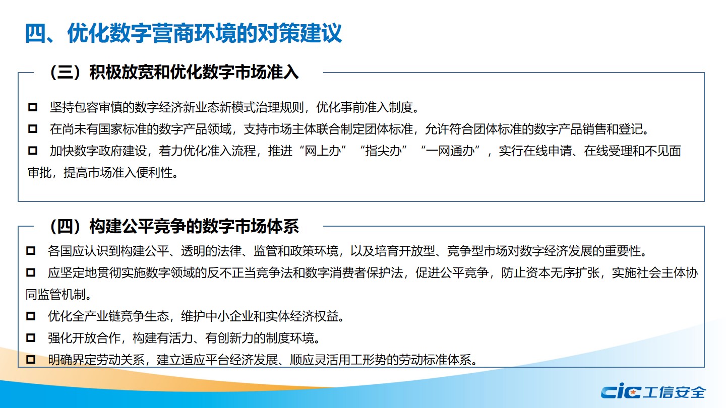 報告強調,持續優化數字營商環境是數字經濟發展的重要條件??傮w來看,各國的數字營商環境還有較大提升空間,這要求各國要進一步完善數字支撐體系,加快網絡基礎設施建設;平衡好發展和安全的關系,堅持數據開發利用與安全保護同步推進;積極放寬和優化數字市場準入,堅持包容審慎的新業態新模式治理規則;構建公平競爭的數字市場體系,并營造良好的數字創新環境。