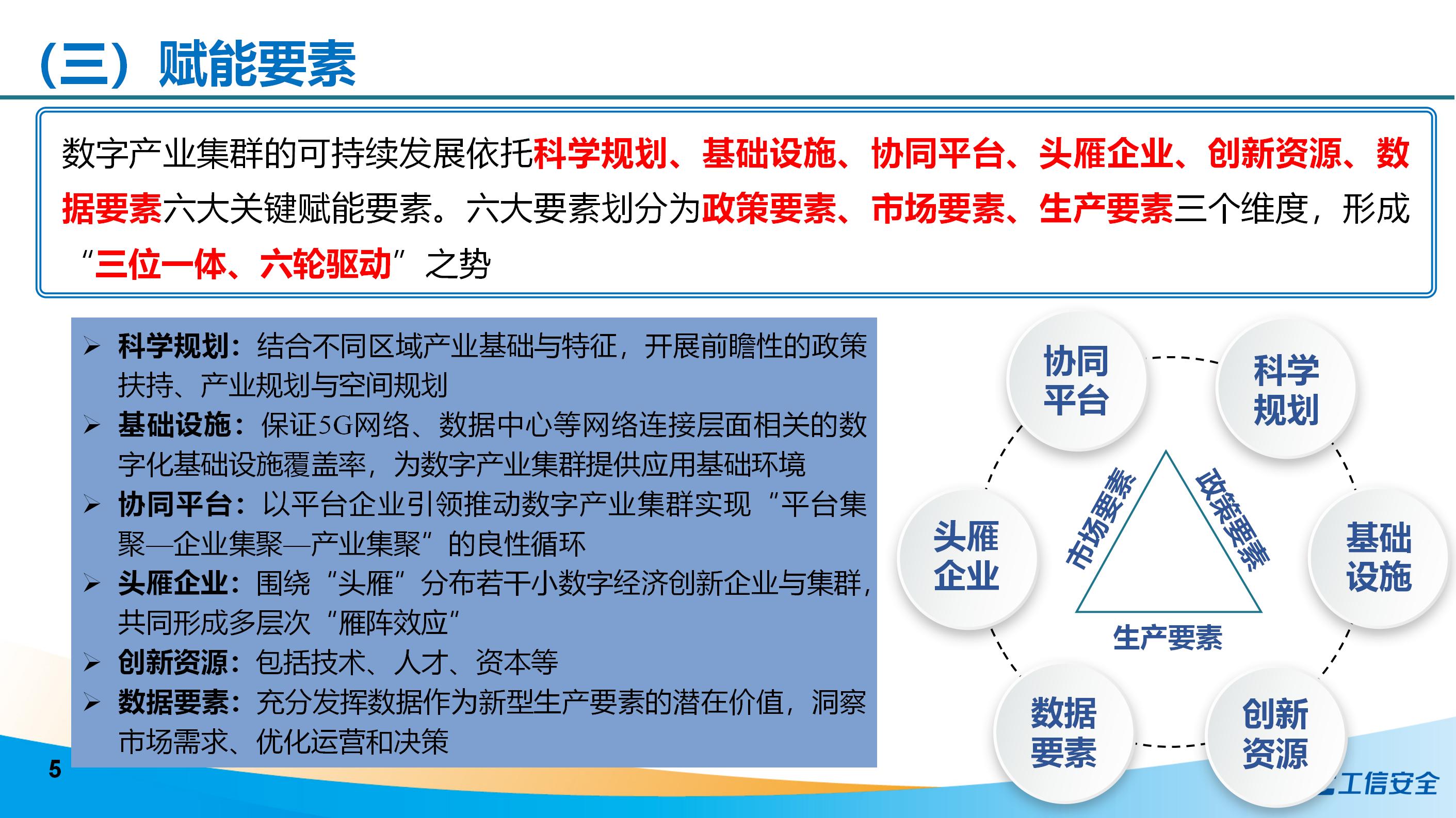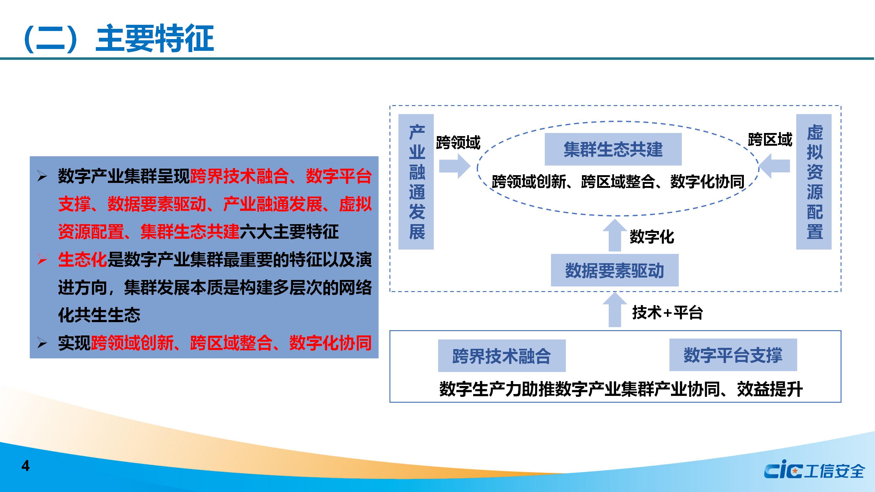 研究報告指出數字產業集群是以新發展理念為引領,從事數字產品制造、數字產品服務、數字技術應用、數字要素驅動、數字化效率提升的企業主體及其相關機構等組成的具有較強核心競爭力的企業集群。數字產業集群呈現跨界技術融合、數字平臺支撐、數據要素驅動、產業融通發展、虛擬資源配置、集群生態共建六大主要特征,其可持續發展依托科學規劃、基礎設施、協同平臺、頭雁企業、創新資源、數據要素六大關鍵賦能要素。