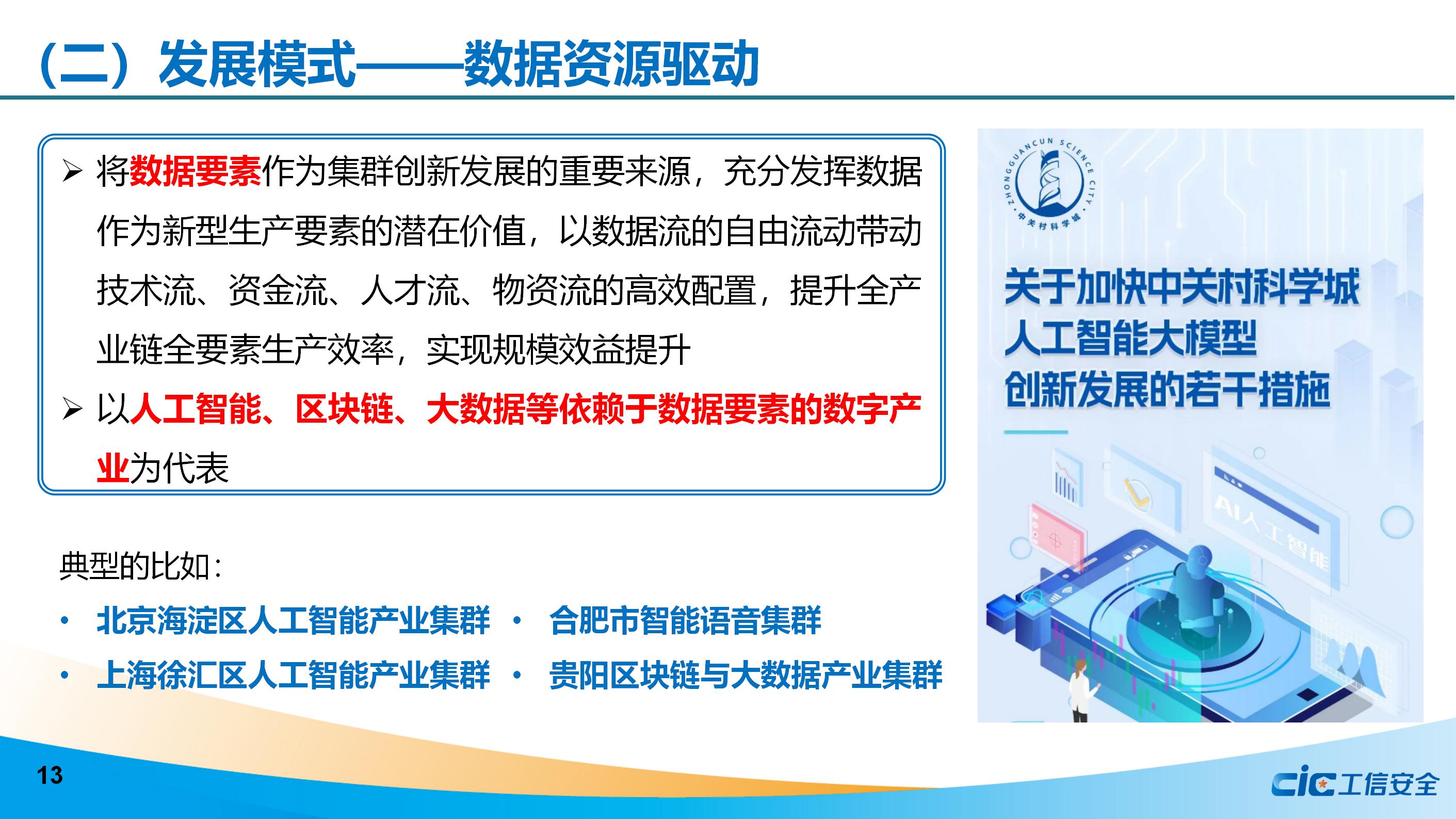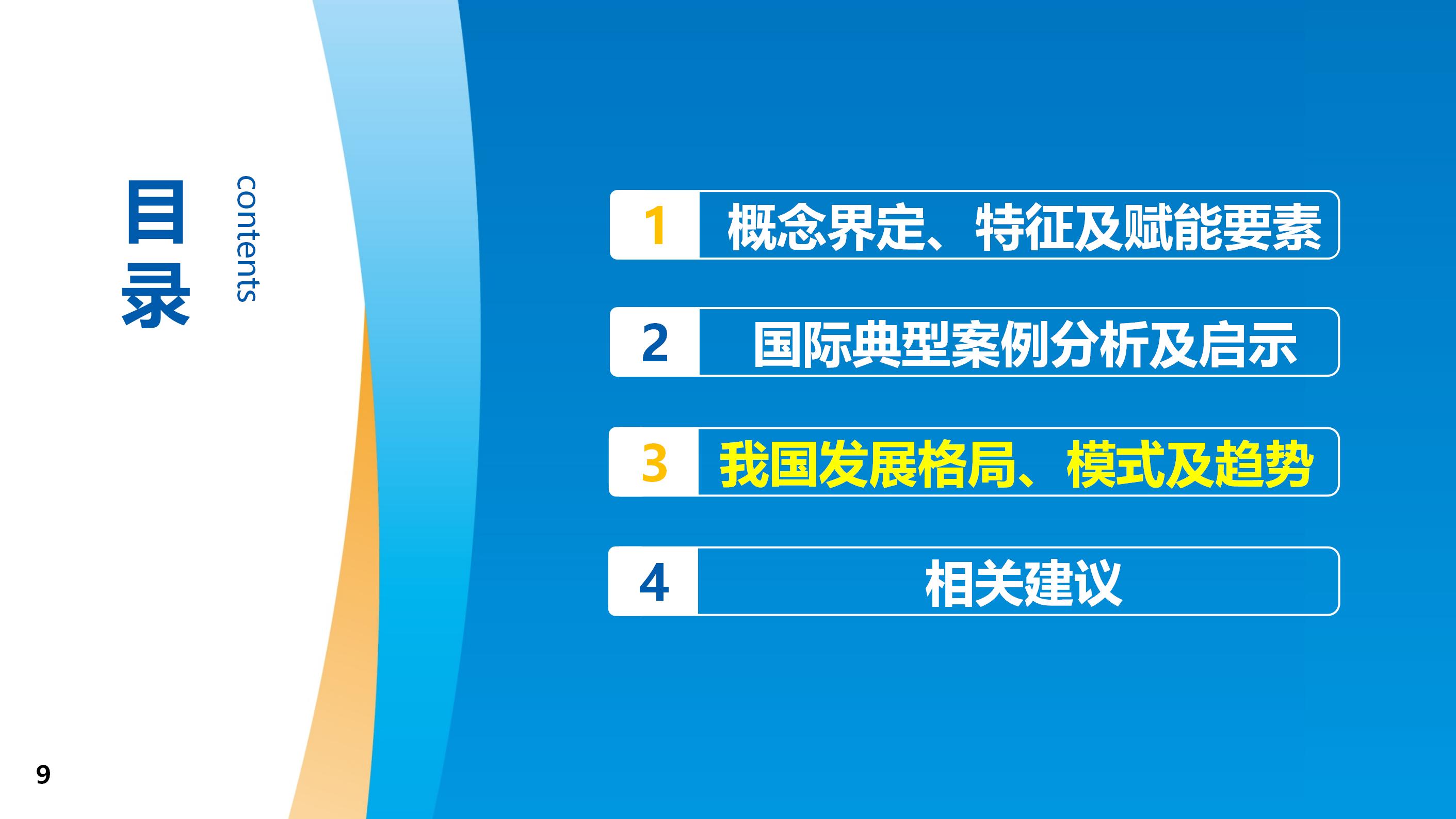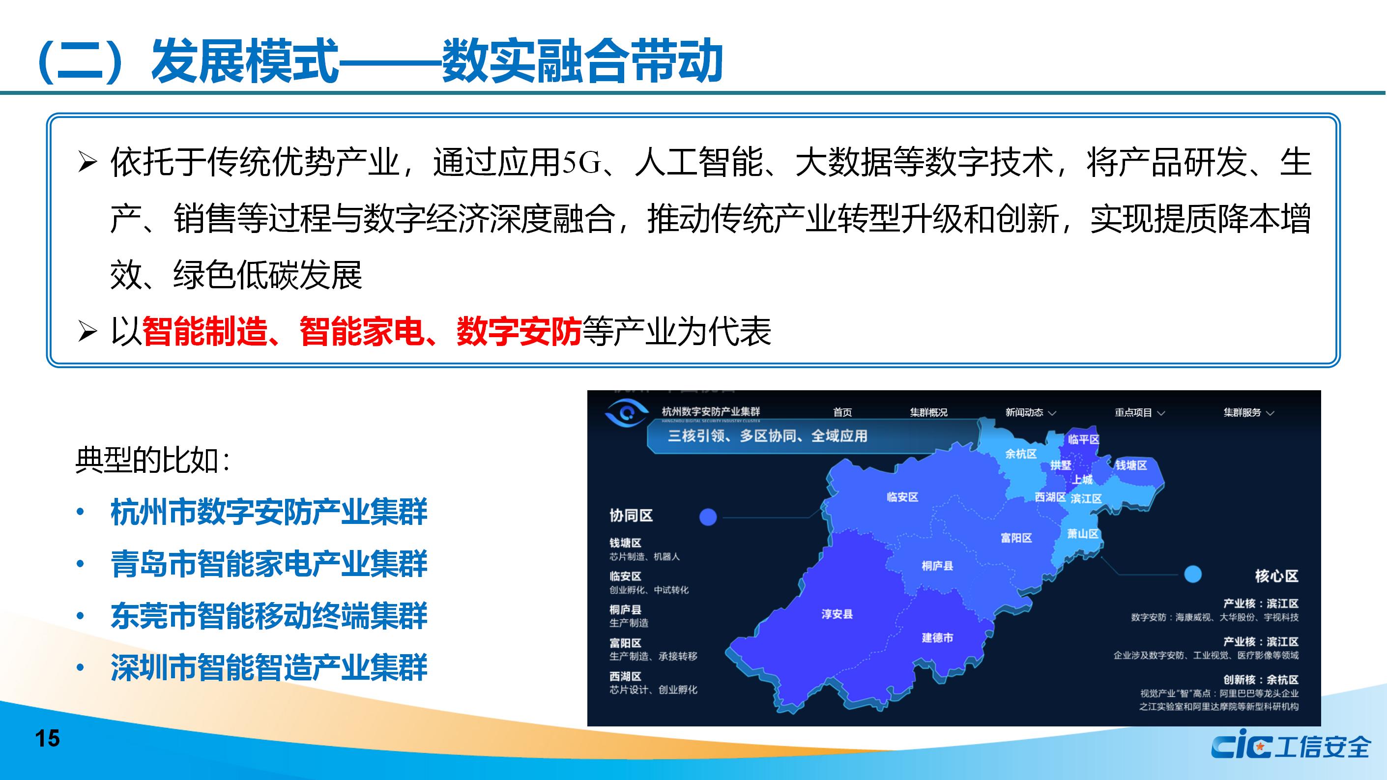 根據依托的資源稟賦不同,當前我國數字產業集群可劃分為數據資源驅動、數字技術牽引、數實融合帶動、網絡平臺支撐四種發展模式。數據資源驅動模式將數據要素作為集群創新發展的重要來源,充分發揮數據作為新型生產要素的潛在價值,以數據流的自由流動帶動技術流、資金流、人才流、物資流的高效配置,提升全產業鏈全要素生產效率,實現規模效益提升,以人工智能、區塊鏈、大數據等依賴于數據要素的數字產業為代表。數字技術牽引模式把數字技術創新作為集群發展的命脈和根基所在,通過數字技術的研發突破、成果轉化,促進技術創新鏈和產業鏈深度融合,加快形成新產品新模式新業態,匯聚一批創新型企業及其研發和服務機構,以新一代信息通信、電子信息制造、軟件等傳統信息產業為代表。數實融合帶動模式依托傳統優勢產業,通過應用5G、人工智能、大數據等數字技術,將產品研發、生產、銷售等過程與數字經濟深度融合,推動傳統產業轉型升級和創新,實現提質降本增效、綠色低碳發展,以智能制造、智能家電、數字安防等產業為代表。網絡平臺支撐模式依托互聯網等信息網絡,搭建數字化支撐平臺等載體,打破時間、空間等物理條件,推動集群內企業之間、產業鏈上下游資源共享、要素協同,實現產業供需調配和精準對接。此類產業集聚突出表現在基于數字技術的網絡空間虛擬集聚。未來,我國數字產業集群的發展將呈現跨界融合、產業生態化、開放合作、綠色可持續的趨勢。