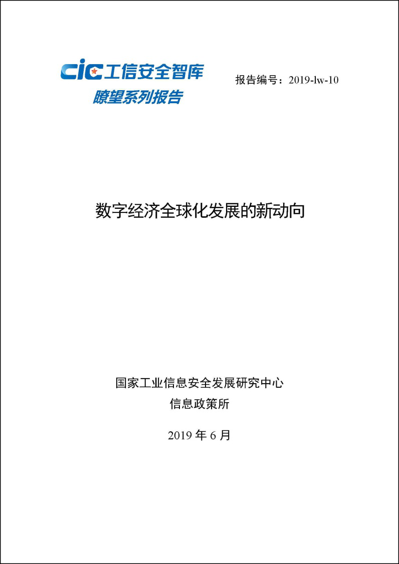 2019年6月,工信安全智庫推出“瞭望系列報告”——《數字經濟全球化發展的新動向》。報告主要對近年來數字技術變革對全球化發展的影響進行研究,通過解讀各大國際組織發布的相關報告,總結了數字技術對全球生產方式、貿易格局與價值鏈的影響,強調了數字時代的互聯性特征和數字合作的必要性,為我國在該領域把握機遇和應對挑戰提供思路。