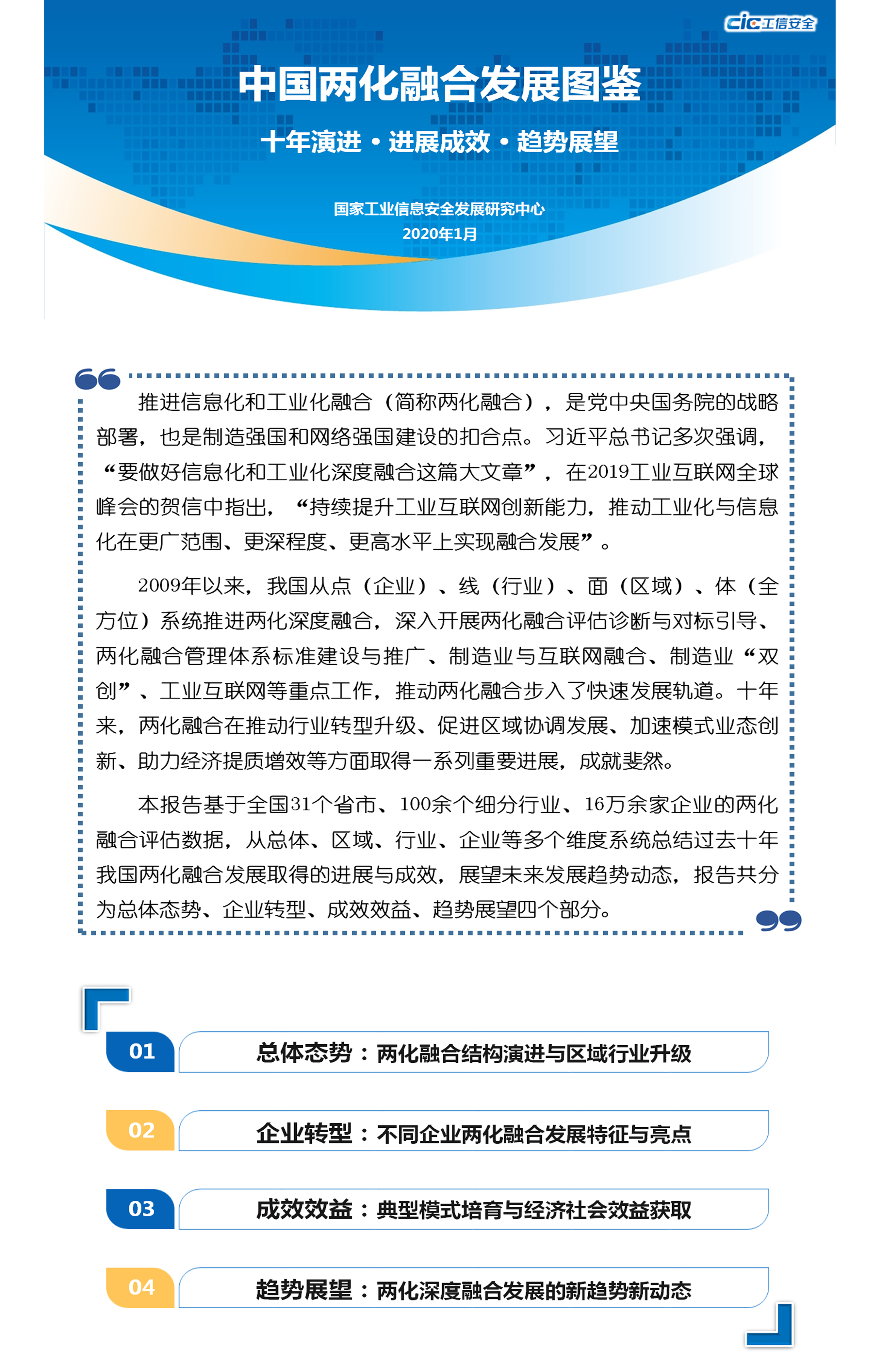 2020年1月10日,國家工業信息安全發展研究中心在北京成功舉辦首屆工信安全智庫論壇。論壇上,國家工業信息安全發展研究中心信息化所副所長李君發布并深入解讀了《中國兩化融合發展圖鑒:十年演進、進展成效、趨勢展望》報告。該報告由工業和信息化部信息技術發展司指導,系統總結了過去十年(2009-2019年)我國兩化融合發展取得的進展與成效,展望了未來發展趨勢,致力于探析與解答以下重大議題: