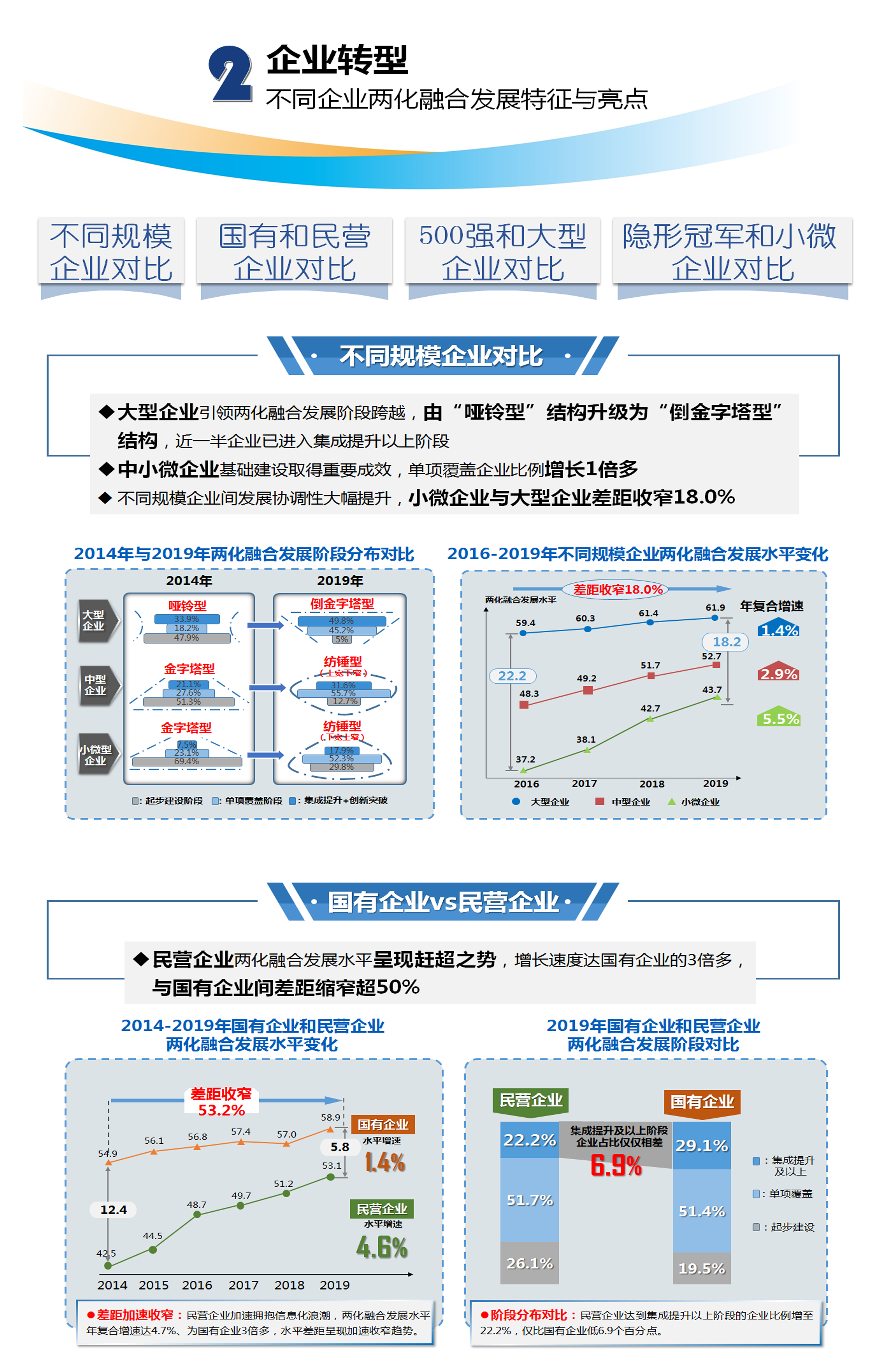 2. 企業轉型:作為兩化融合的主體,各類企業(大型企業、中小微企業、國有企業、民營企業、500強企業、隱形冠軍企業等)的兩化融合發展具有哪些特征和亮點?