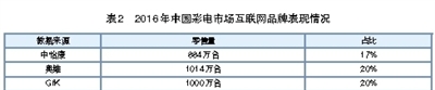 根據《中國電子報》采訪收集,各大市場調研機構對2016年中國彩電市場互聯網品牌電視零售量情況預計如下(見表2),其中最保守的為中怡康,比較樂觀的是奧維。總體而言,經過2016年的發展,互聯網品牌電視已經占整體中國彩電市場零售量的近2成份額,互聯網品牌成為彩電市場不可小覷的一股力量。