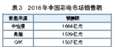 彩電市場總銷售量提升本是好事,但事實上,2016年彩電行業“增量不增收”。根據中國電子視像行業協會的統計,1~10月份,中國彩電市場銷售量規模增長了6.6%,銷售額規模卻下降了5%。各市調機構也給出了年度中國彩電市場零售額數據(見表3)。