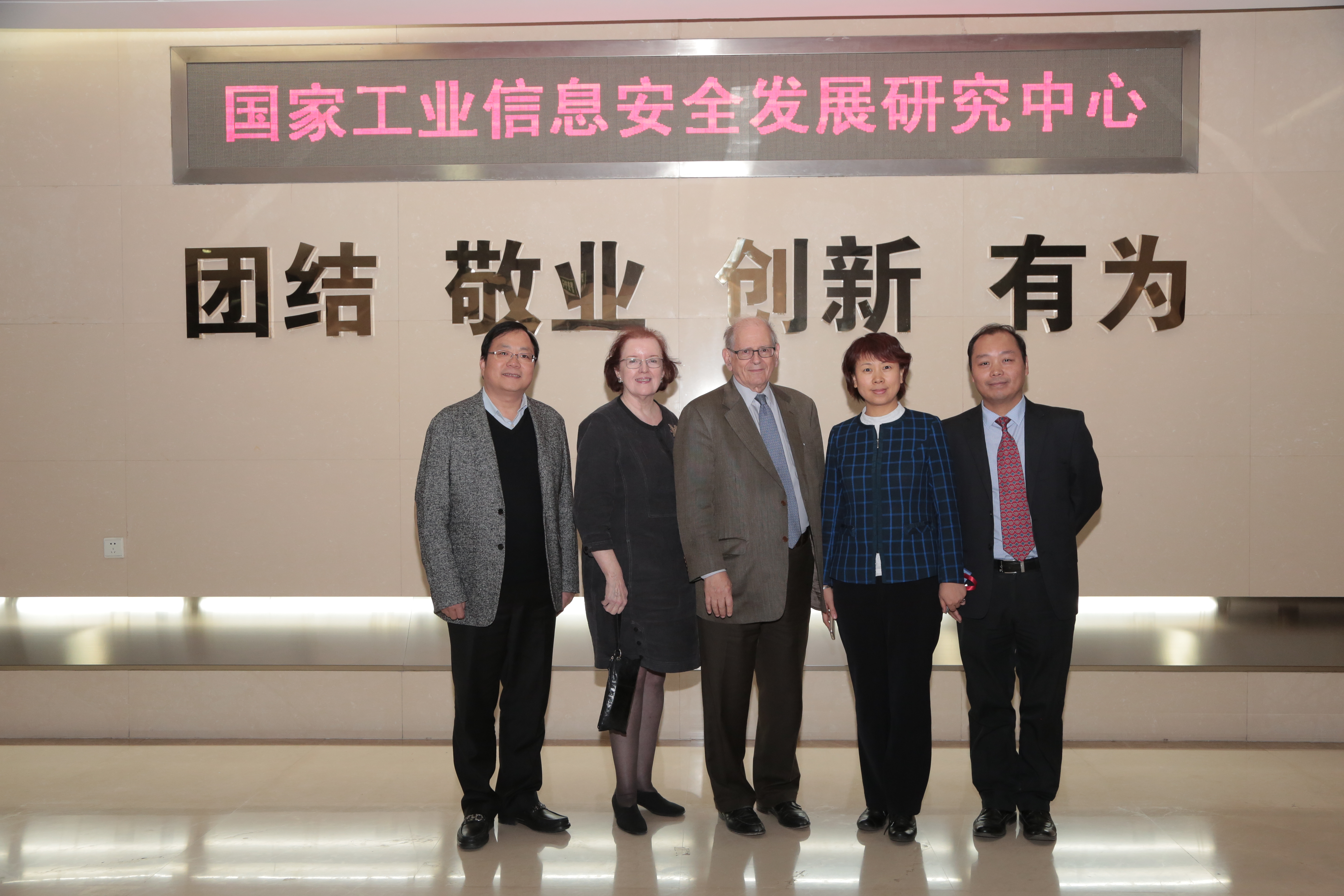 TCP/IP協議共同發明人羅伯特?卡恩(Robert. E. Kahn)博士(右三)及夫人(左二)、國家工業信息安全發展研究中心尹麗波主任(右二)、何小龍副主任(左一)、國家工業信息安全發展研究中心信息化研究與促進中心周劍主任(右一)