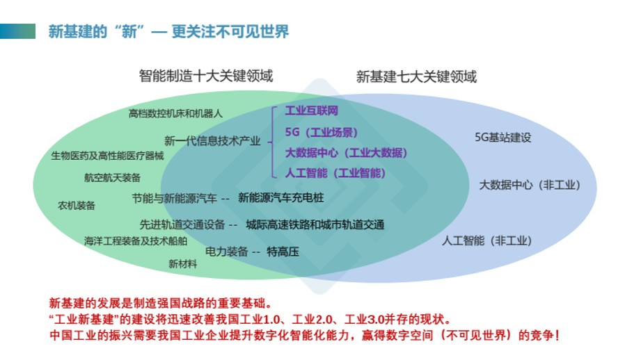 孫昕指出,我們將新基建的關鍵領域與智能制造的關鍵領域進行對比,發現其中重合的大部分是工業互聯網、工業智能等新一代信息技術,而這些核心技術的應用場景,我們稱之為“不可見世界”。新基建,是在數字經濟時代,通過科技構建數據從傳輸到分析再到決策支持的基礎設施,實現對物理空間背后不可見世界的管理。這也是工業新基建的核心,更是工業高質量發展的關鍵支撐。