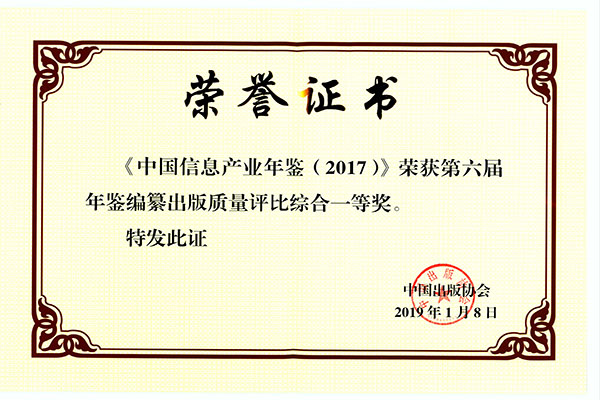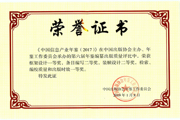 在由中國出版協會主辦、中國出版協會年鑒工作委員會承辦的第六屆全國年鑒編纂出版質量評比活動中,我中心主辦的《中國信息產業年鑒(2017)》榮獲綜合一等獎和框架設計一等獎、條目編寫二等獎、裝幀設計二等獎以及檢索、編校質量和出版時效一等獎等多個單項獎。2019年5月9日,第六屆年鑒編纂出版質量評比頒獎大會暨第二十次全國地州區縣年鑒研討會在成都隆重舉行,來自中央級年鑒、央企年鑒、地方年鑒及高校年鑒的300余位代表參加了大會。