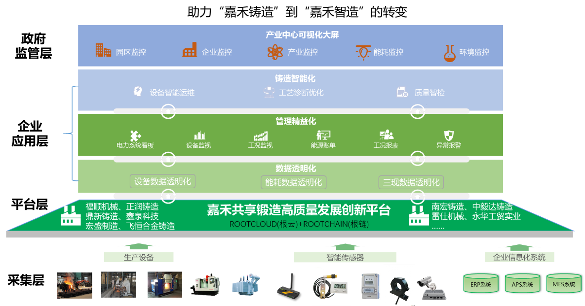 聯(lián)合樹(shù)根互聯(lián)股份有限公司及園區(qū)十家龍頭企業(yè)進(jìn)行三方合作,共同打造嘉禾鑄鍛造產(chǎn)業(yè)集群工業(yè)互聯(lián)網(wǎng)平臺(tái),形成了包含采集層、平臺(tái)層、企業(yè)應(yīng)用層和政府監(jiān)管層四個(gè)部分的產(chǎn)業(yè)集群“能源管理”解決方案。由政府和產(chǎn)業(yè)促進(jìn)中心負(fù)責(zé)平臺(tái)的投資建設(shè)與政策支持,樹(shù)根互聯(lián)負(fù)責(zé)平臺(tái)的實(shí)施落地及業(yè)務(wù)運(yùn)維,園區(qū)企業(yè)提供平臺(tái)的應(yīng)用場(chǎng)景并協(xié)同創(chuàng)新。